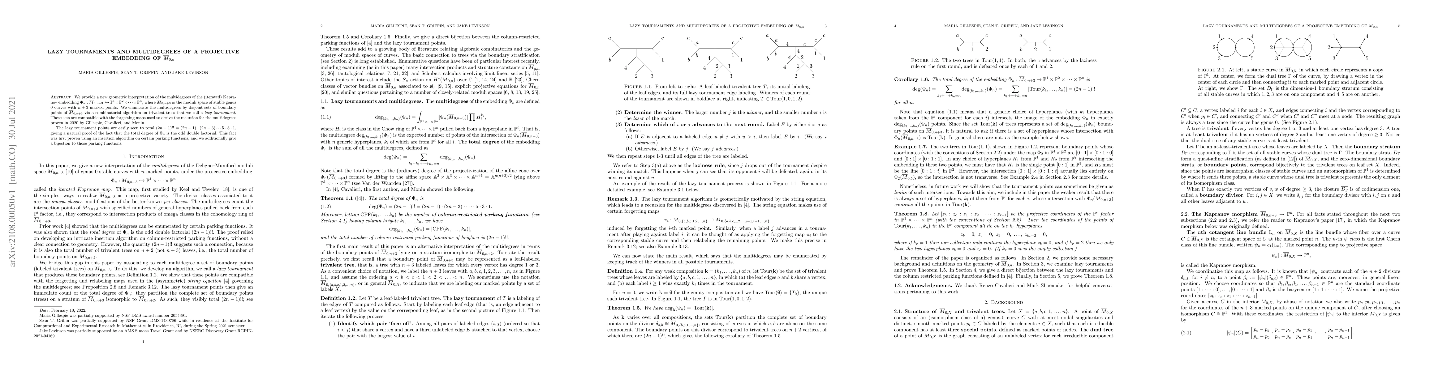 Researchers provide a new geometric interpretation of multidegrees in a projective embedding of moduli spaces of stable genus 0 curves with marked points, using a combinatorial algorithm called a lazy tournament to enumerate the multidegrees.