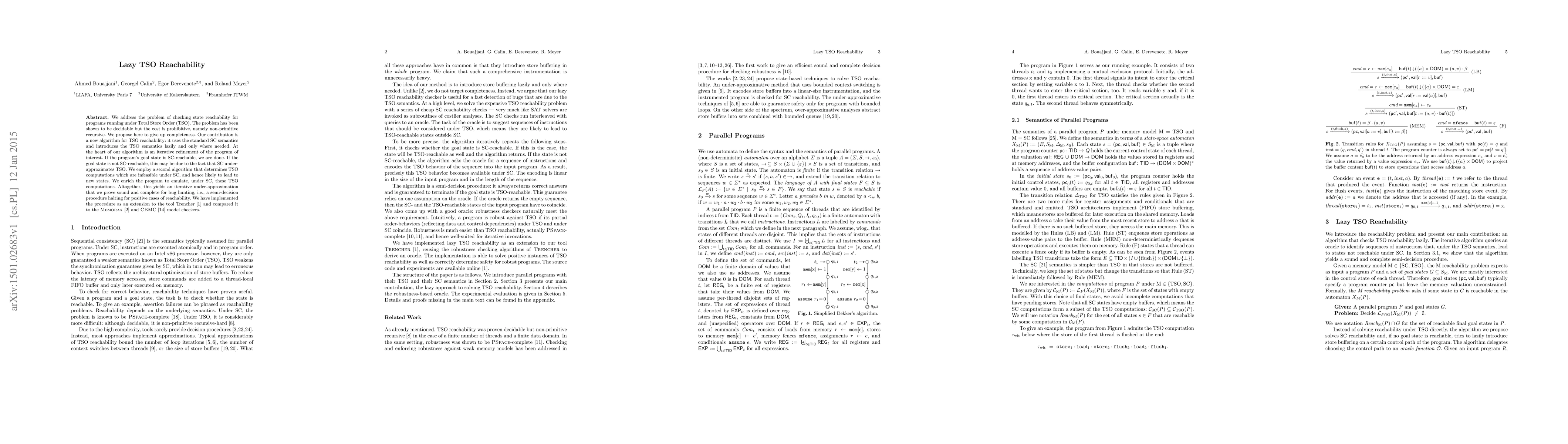 This paper proposes a new algorithm for checking state reachability under Total Store Order (TSO) semantics, employing an iterative refinement approach that lazily introduces TSO semantics where necessary. The algorithm enriches the program to emulate infeasible TSO computations under SC semantics, providing a sound and complete semi-decision procedure for bug hunting.