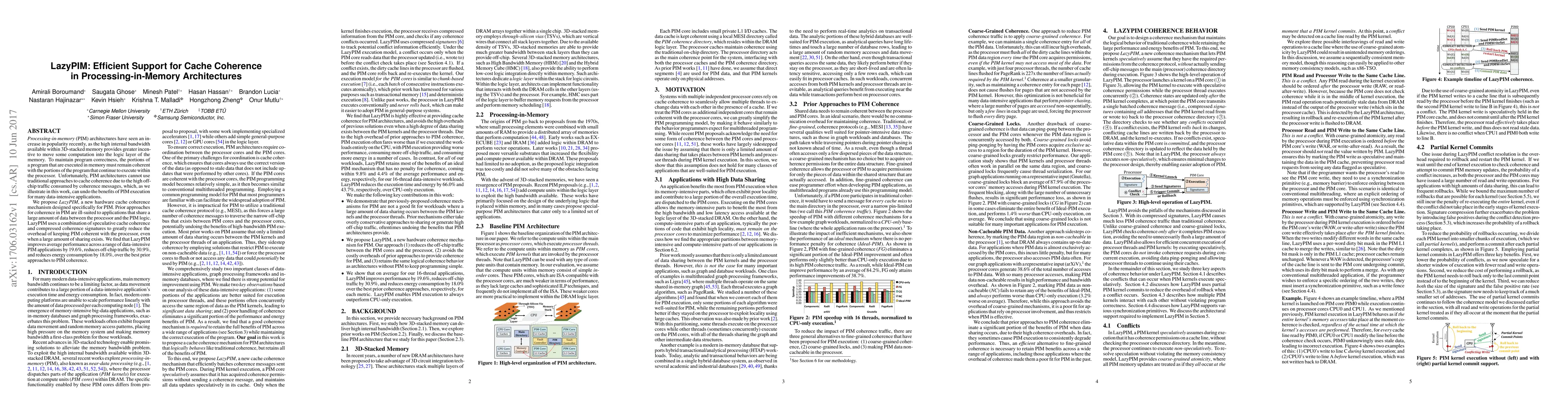 LazyPIM introduces a novel cache coherence mechanism tailored for processing-in-memory (PIM) architectures, addressing the high off-chip traffic issue that traditional coherence methods cause. It achieves significant performance, off-chip traffic, and energy savings by employing speculative cache coherence and compressed signatures, improving data-intensive PIM applications by 19.6%, 30.9%, and 18.0%, respectively.