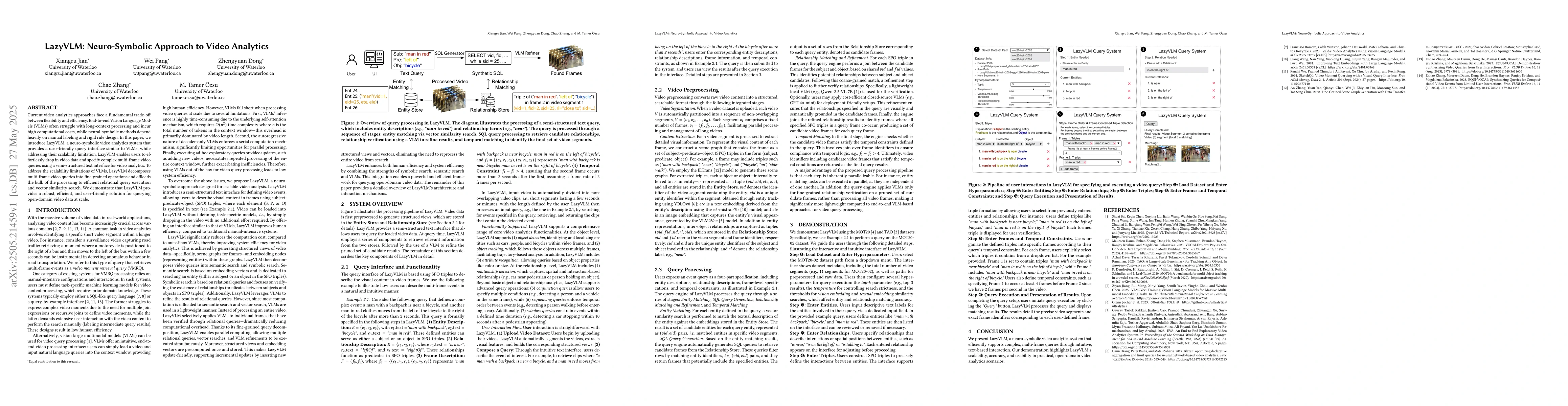 LazyVLM combines neuro-symbolic and relational query methods to provide a user-friendly video analytics system that overcomes scalability limitations of traditional end-to-end VLMs.