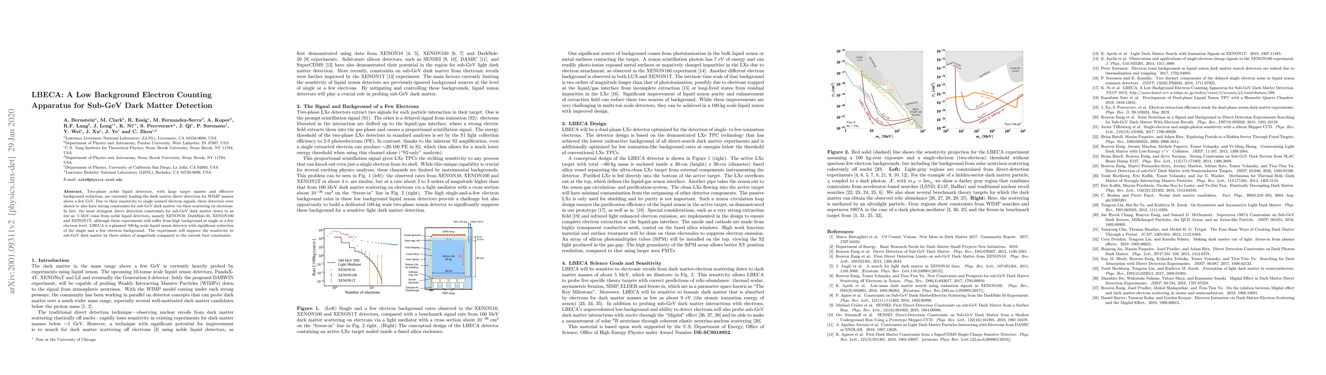 LBECA is a proposed 100-kg liquid xenon detector designed to significantly reduce low-level background noise, aiming to enhance the detection sensitivity of sub-GeV dark matter particles by three orders of magnitude compared to existing experiments.