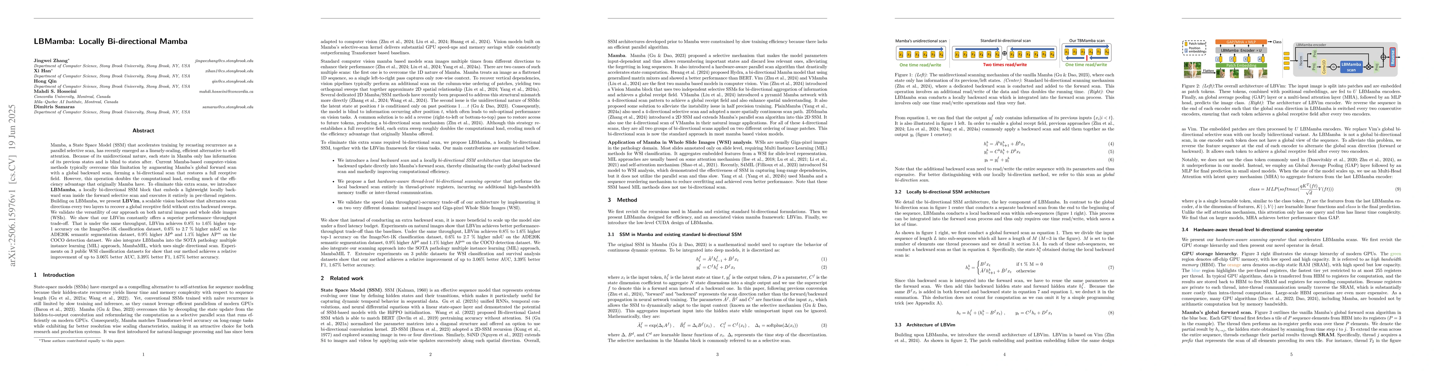 Mamba, a State Space Model (SSM) that accelerates training by recasting recurrence as a parallel selective scan, has recently emerged as a linearly-scaling, efficient alternative to self-attention. Because of its unidirectional nature, each state in Mamba only has information of its previous states and is blind to states after. Current Mamba-based computer-vision methods typically overcome this limitation by augmenting Mamba's global forward scan with a global backward scan, forming a bi-directional scan that restores a full receptive field. However, this operation doubles the computational load, eroding much of the efficiency advantage that originally Mamba have. To eliminate this extra scans, we introduce LBMamba, a locally bi-directional SSM block that embeds a lightweight locally backward scan inside the forward selective scan and executes it entirely in per-thread registers. Building on LBMamba, we present LBVim, a scalable vision backbone that alternates scan directions every two layers to recover a global receptive field without extra backward sweeps. We validate the versatility of our approach on both natural images and whole slide images (WSIs). We show that our LBVim constantly offers a superior performance-throughput trade-off. That is under the same throughput, LBVim achieves 0.8% to 1.6% higher top-1 accuracy on the ImageNet-1K classification dataset, 0.6% to 2.7% higher mIoU on the ADE20K semantic segmentation dataset, 0.9% higher APb and 1.1% higher APm on the COCO detection dataset. We also integrate LBMamba into the SOTA pathology multiple instance learning (MIL) approach, MambaMIL, which uses single directional scan. Experiments on 3 public WSI classification datasets for show that our method achieves a relative improvement of up to 3.06% better AUC, 3.39% better F1, 1.67% better accuracy.