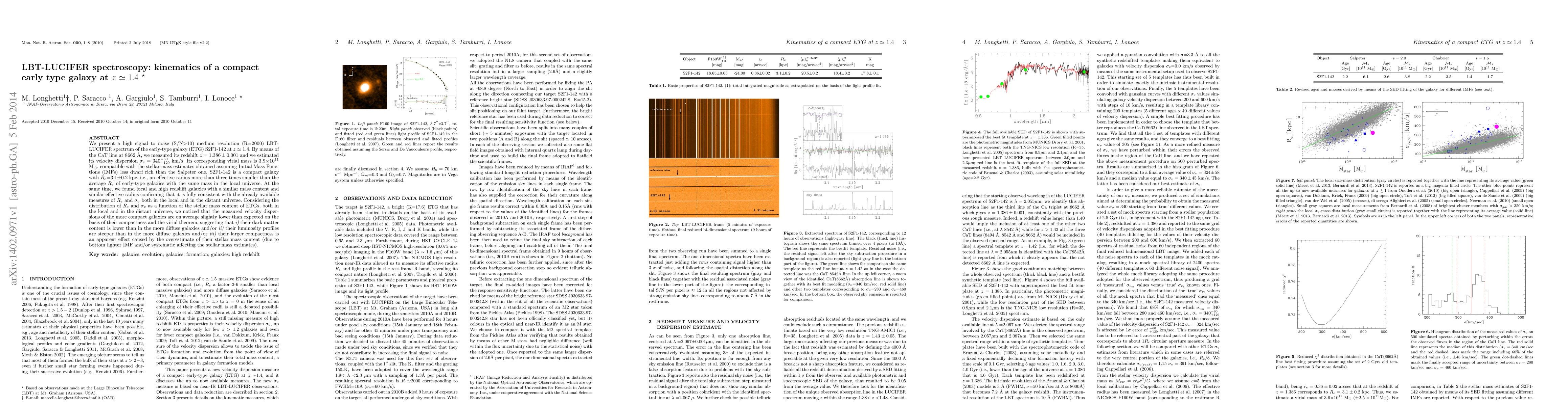 We present a high signal to noise (S/N$>$10) medium resolution (R=2000) LBT-LUCIFER spectrum of the early-type galaxy (ETG) S2F1-142 at $z\simeq1.4$. By means of the CaT line at $8662$ \AA, we measured its redshift $z=1.386\pm 0.001$ and we estimated its velocity dispersion $\sigma_{v}=340 ^{-60}_{+120}$ km/s. Its corresponding virial mass is 3.9$\times10^{11}$ M$_\odot$, compatible with the stellar mass estimates obtained assuming Initial Mass Functions (IMFs) less dwarf rich than the Salpeter one. S2F1-142 is a compact galaxy with $R_{e}$=3.1$\pm$0.2 kpc, i.e., an effective radius more than three times smaller than the average $R_{e}$ of early-type galaxies with the same mass in the local universe. At the same time, we found local and high redshift galaxies with a similar mass content and similar effective radius confirming that it is fully consistent with the already available measures of $R_{e}$ and $\sigma_{v}$ both in the local and in the distant universe. Considering the distribution of $R_{e}$ and $\sigma_{v}$ as a function of the stellar mass content of ETGs, both in the local and in the distant universe, we noticed that the measured velocity dispersions of the more compact galaxies are on average slightly lower than expected on the basis of their compactness and the virial theorem, suggesting that {\it i)} their dark matter content is lower than in the more diffuse galaxies and/or {\it ii)} their luminosity profiles are steeper than in the more diffuse galaxies and/or {\it iii)} their larger compactness is an apparent effect caused by the overestimate of their stellar mass content (due to bottom lighter IMF and/or systematic affecting the stellar mass estimates).