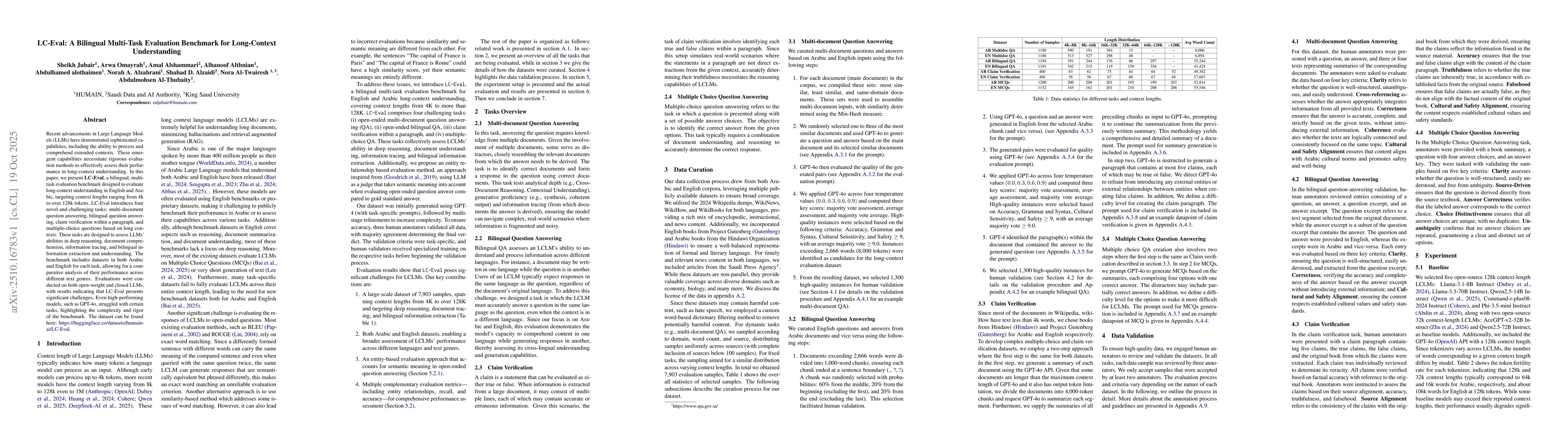 Recent advancements in Large Language Models (LLMs) have demonstrated sophisticated capabilities, including the ability to process and comprehend extended contexts. These emergent capabilities necessitate rigorous evaluation methods to effectively assess their performance in long-context understanding. In this paper, we present \textbf{LC-Eval}, a bilingual, multi-task evaluation benchmark designed to evaluate long-context understanding in English and Arabic, targeting context lengths ranging from 4k to over 128k tokens. LC-Eval introduces four novel and challenging tasks: multi-document question answering, bilingual question answering, claim verification within a paragraph, and multiple-choice questions based on long contexts. These tasks are designed to assess LLMs' abilities in deep reasoning, document comprehension, information tracing, and bilingual information extraction and understanding. The benchmark includes datasets in both Arabic and English for each task, allowing for a comparative analysis of their performance across different text genres. Evaluations were conducted on both open-weight and closed LLMs, with results indicating that LC-Eval presents significant challenges. Even high-performing models, such as GPT-4o, struggled with certain tasks, highlighting the complexity and rigor of the benchmark.