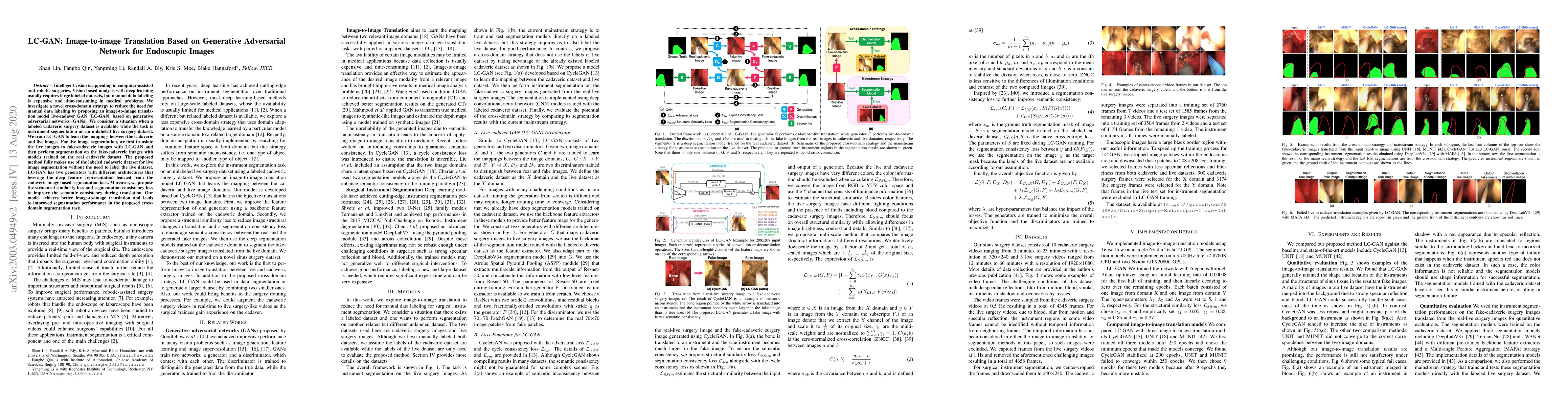The LC-GAN model uses generative adversarial networks for image-to-image translation to enable segmentation of live surgical images using a labeled cadaveric dataset, thus reducing the need for manual labeling of live data. The method employs two generators and additional loss functions to improve translation accuracy and segmentation consistency.
