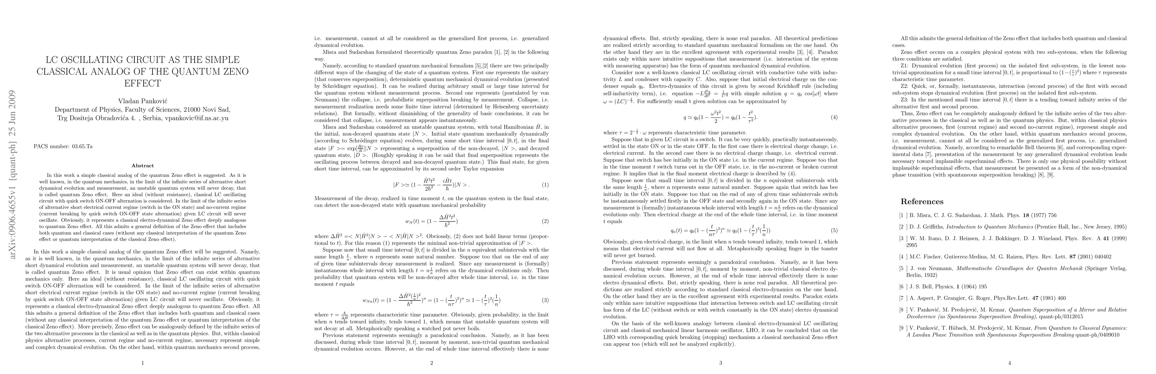 This paper proposes a classical LC oscillating circuit as an analog for the quantum Zeno effect, where frequent switching between ON and OFF states prevents the circuit from oscillating, mirroring the quantum phenomenon where frequent measurements halt decay. The study suggests a unified definition of the Zeno effect applicable to both classical and quantum systems.