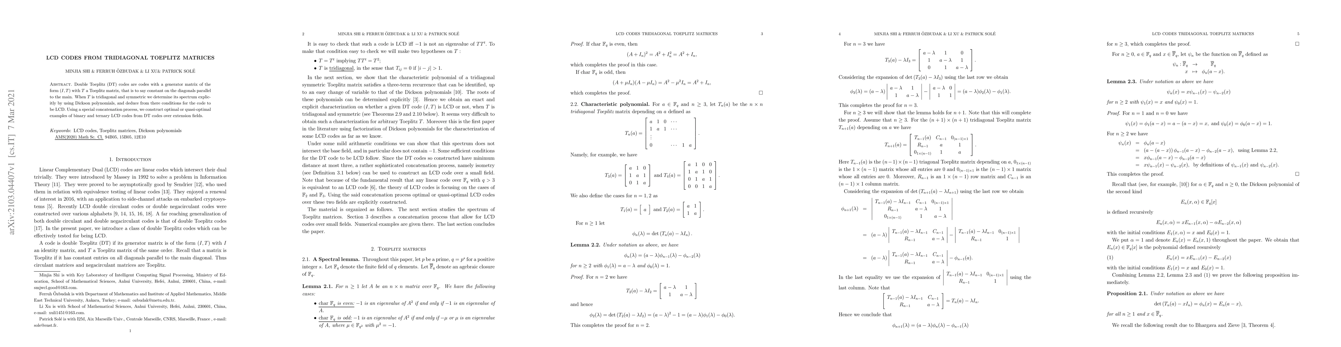 This paper determines the spectrum of tridiagonal symmetric Toeplitz matrices using Dickson polynomials and deduces conditions for the associated double Toeplitz codes to be LCD. It also constructs optimal or quasi-optimal binary and ternary LCD codes via a special concatenation process.