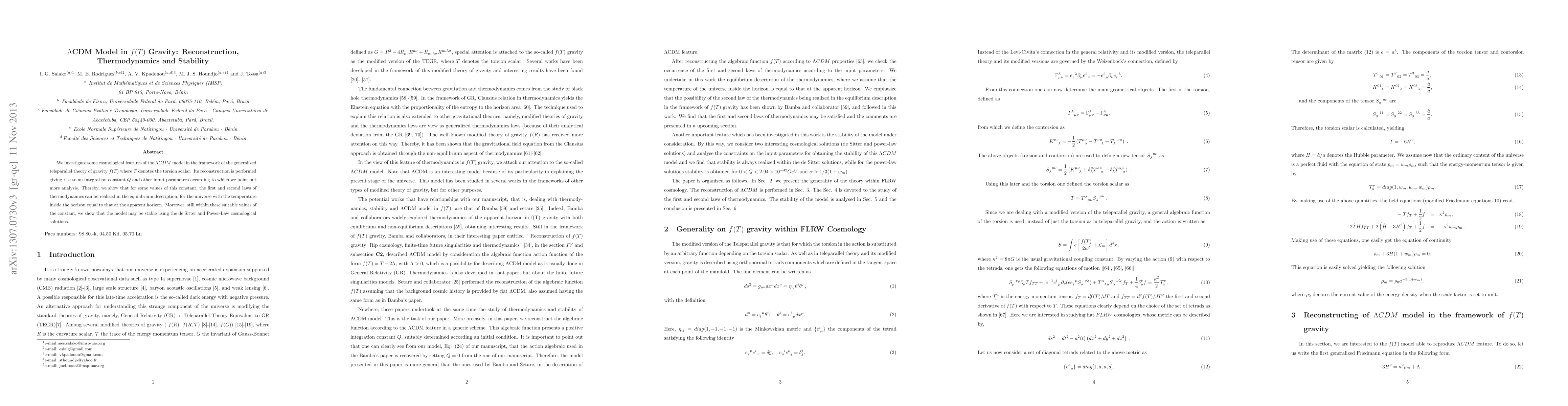 We investigate some cosmological features of the LCDM model in the framework of the generalized teleparallel theory of gravity f(T) where T denotes the torsion scalar. Its reconstruction is performed giving rise to an integration constant Q and other input parameters according to which we point out more analysis. Thereby, we show that for some values of this constant, the first and second laws of thermodynamics can be realized in the equilibrium description, for the universe with the temperature inside the horizon equal to that at the apparent horizon. Moreover, still within these suitable values of the constant, we show that the model may be stable using the de Sitter and Power-Law cosmological solutions.