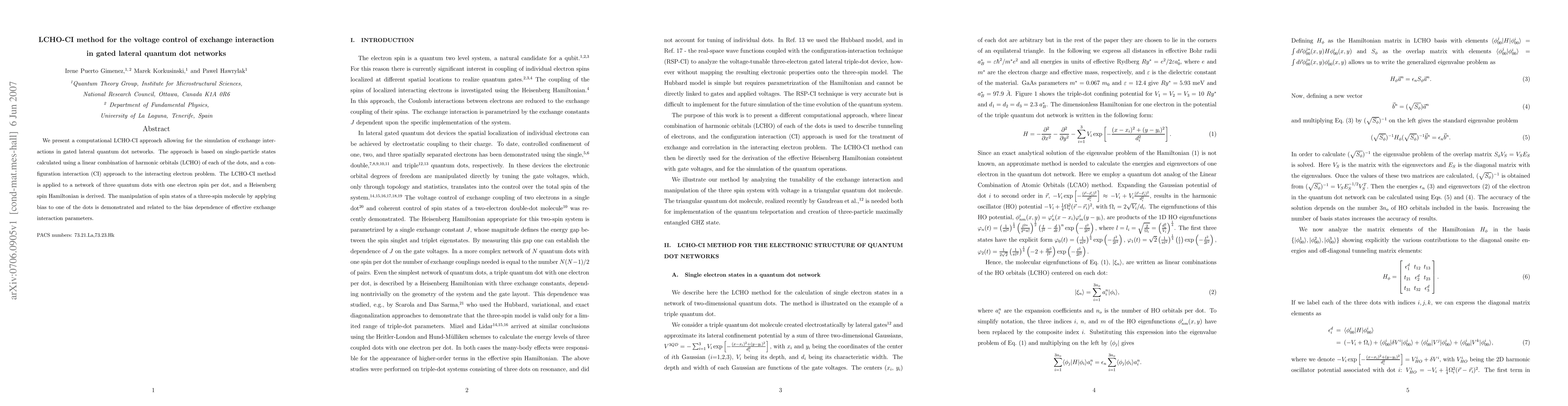 We present a computational LCHO-CI approach allowing for the simulation of exchange interactions in gated lateral quantum dot networks. The approach is based on single-particle states calculated using a linear combination of harmonic orbitals (LCHO) of each of the dots, and a configuration interaction (CI) approach to the interacting electron problem. The LCHO-CI method is applied to a network of three quantum dots with one electron spin per dot, and a Heisenberg spin Hamiltonian is derived. The manipulation of spin states of a three-spin molecule by applying bias to one of the dots is demonstrated and related to the bias dependence of effective exchange interaction parameters.