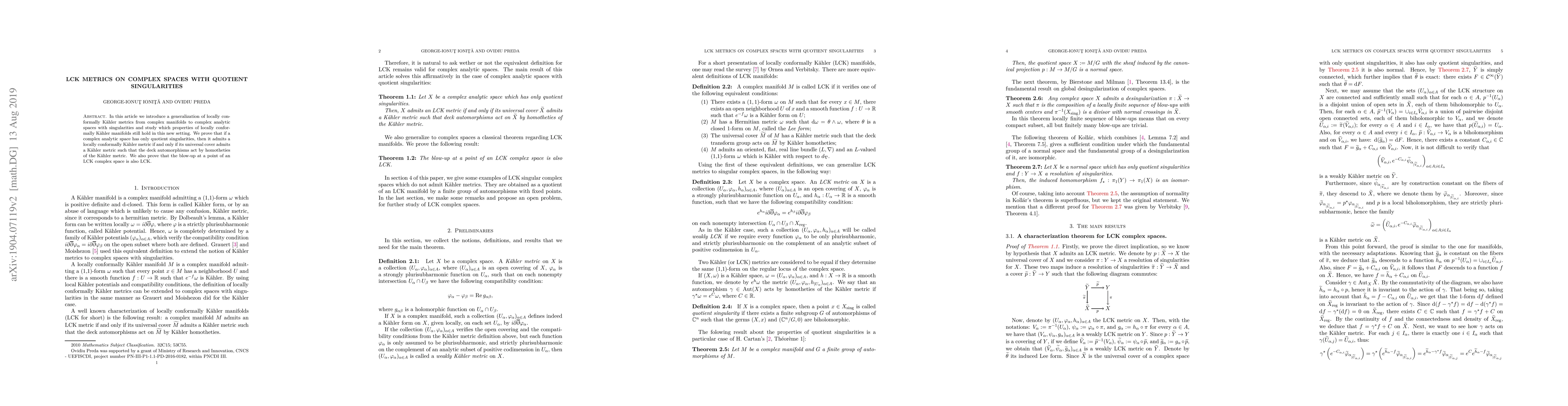 This paper generalizes locally conformally Kähler (LCK) metrics to complex analytic spaces with quotient singularities, showing that such spaces admit LCK metrics if their universal covers allow Kähler metrics acted upon by homotheties. The study also proves that the blow-up of an LCK complex space remains LCK.