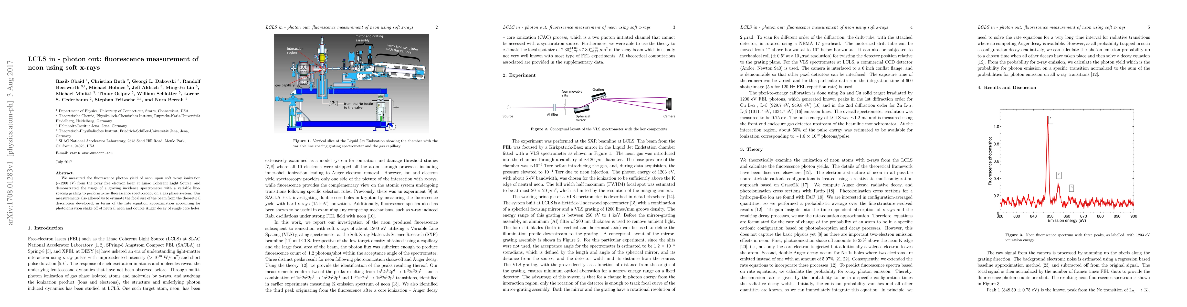 We measured the fluorescence photon yield of neon upon soft x-ray ionization (~1200 eV) from the x-ray free electron laser at Linac Coherent Light Source, and demonstrated the usage of a grazing incidence spectrometer with a variable linespacing grating to perform x-ray fluorescence spectroscopy on a gas phase system. Our measurements also allowed us to estimate the focal size of the beam from the theoretical description developed, in terms of the rate equation approximation accounting for photoionization shake-off of neutral neon and double Auger decay of single core holes.