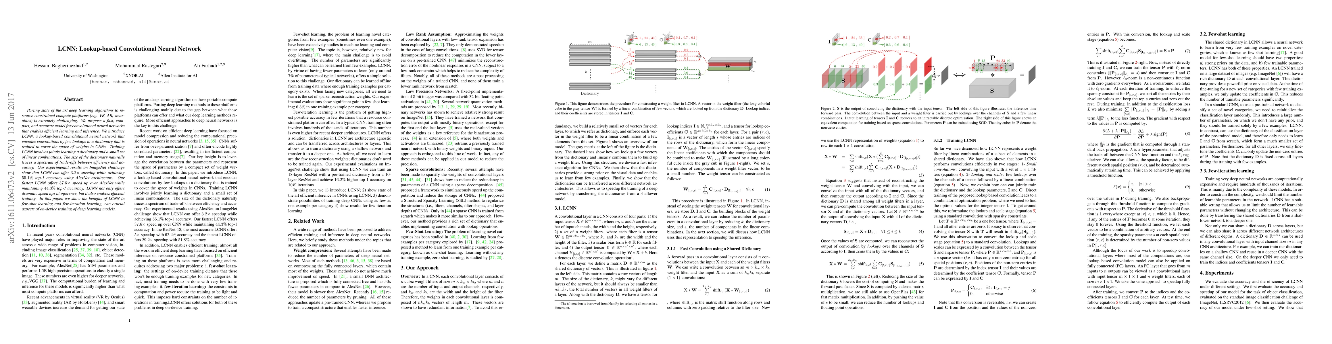 Porting state of the art deep learning algorithms to resource constrained compute platforms (e.g. VR, AR, wearables) is extremely challenging. We propose a fast, compact, and accurate model for convolutional neural networks that enables efficient learning and inference. We introduce LCNN, a lookup-based convolutional neural network that encodes convolutions by few lookups to a dictionary that is trained to cover the space of weights in CNNs. Training LCNN involves jointly learning a dictionary and a small set of linear combinations. The size of the dictionary naturally traces a spectrum of trade-offs between efficiency and accuracy. Our experimental results on ImageNet challenge show that LCNN can offer 3.2x speedup while achieving 55.1% top-1 accuracy using AlexNet architecture. Our fastest LCNN offers 37.6x speed up over AlexNet while maintaining 44.3% top-1 accuracy. LCNN not only offers dramatic speed ups at inference, but it also enables efficient training. In this paper, we show the benefits of LCNN in few-shot learning and few-iteration learning, two crucial aspects of on-device training of deep learning models.