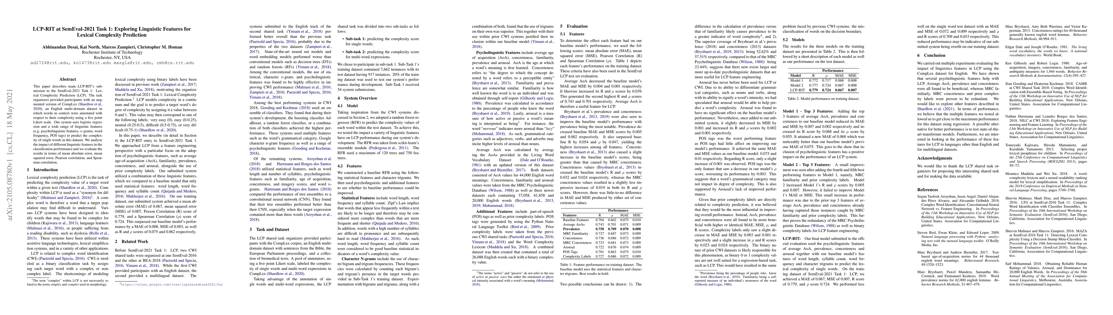 Team LCP-RIT's submission to SemEval-2021 Task 1 employs logistic regression with diverse linguistic features to predict lexical complexity in the CompLex dataset. The study evaluates the effectiveness of various features and assesses performance using multiple correlation metrics.