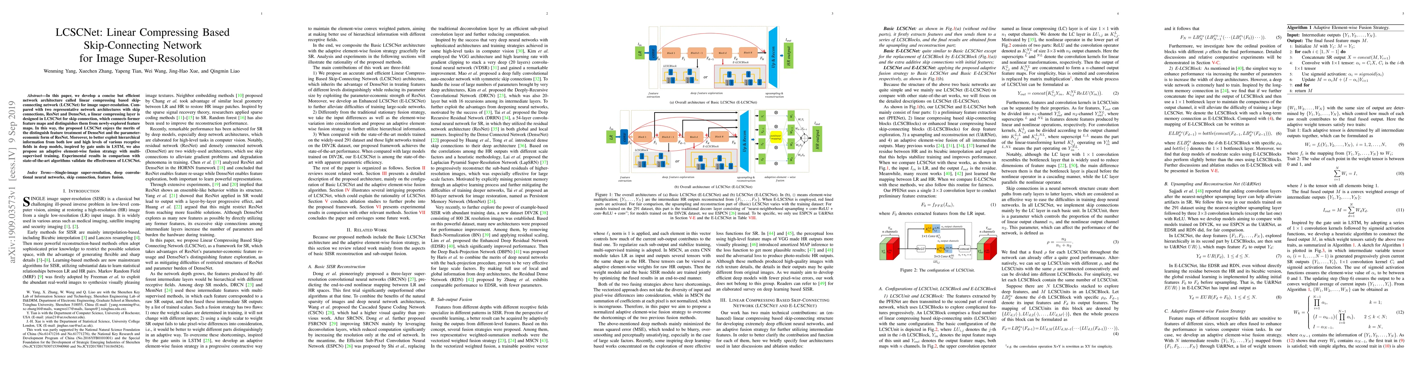 LCSCNet introduces a novel network architecture for image super-resolution that combines linear compressing layers with skip connections, offering the benefits of DenseNet's feature distinction and ResNet's parameter efficiency. It also employs an adaptive fusion strategy to leverage hierarchical information, outperforming existing methods in experiments.