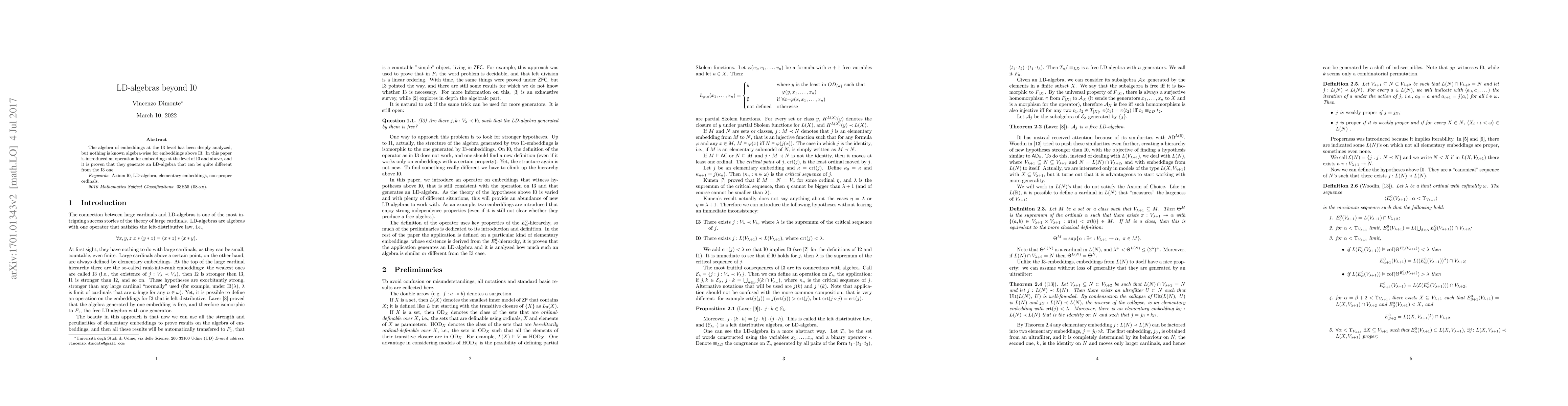 The algebra of embeddings at the I3 level has been deeply analyzed, but nothing is known algebra-wise for embeddings above I3. In this paper it is introduced an operation for embeddings at the level of I0 and above, and it is proven that they generate an LD-algebra that can be quite different from the I3 one.