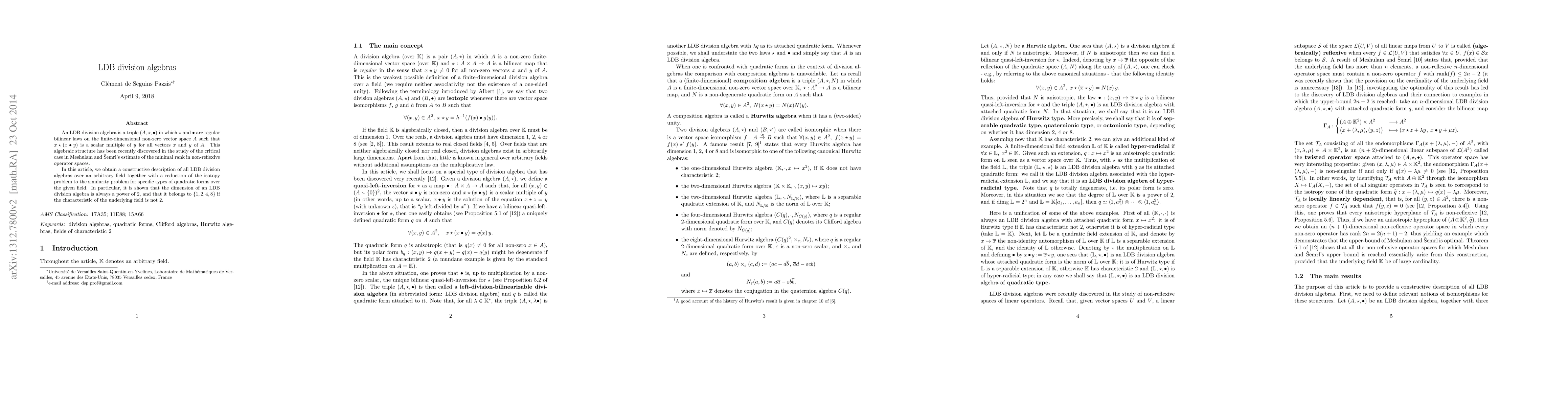 An LDB division algebra is a triple $(A,\star,\bullet)$ in which $\star$ and $\bullet$ are regular bilinear laws on the finite-dimensional non-zero vector space $A$ such that $x \star (x \bullet y)$ is a scalar multiple of $y$ for all vectors $x$ and $y$ of $A$. This algebraic structure has been recently discovered in the study of the critical case in Meshulam and \v Semrl's estimate of the minimal rank in non-reflexive operator spaces. In this article, we obtain a constructive description of all LDB division algebras over an arbitrary field together with a reduction of the isotopy problem to the similarity problem for specific types of quadratic forms over the given field. In particular, it is shown that the dimension of an LDB division algebra is always a power of $2$, and that it belongs to $\{1,2,4,8\}$ if the characteristic of the underlying field is not $2$.