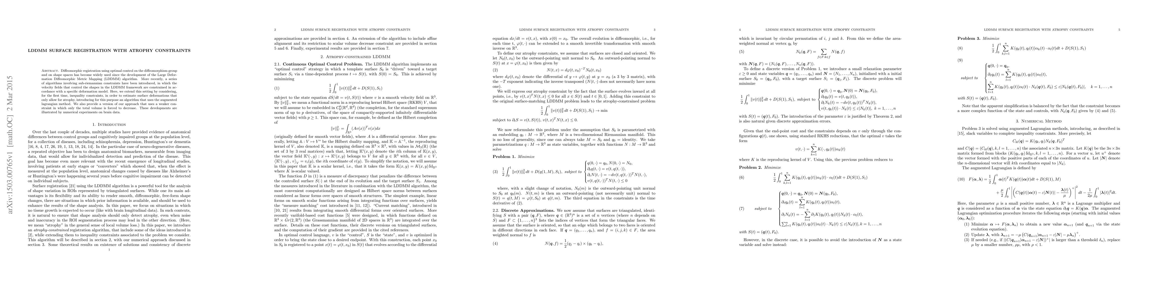 This paper introduces a new LDDMM surface registration method with atrophy constraints, employing augmented Lagrangian optimization to allow only volume-decreasing deformations. It also presents a weaker version that only enforces total volume reduction, demonstrated through numerical experiments on brain data.