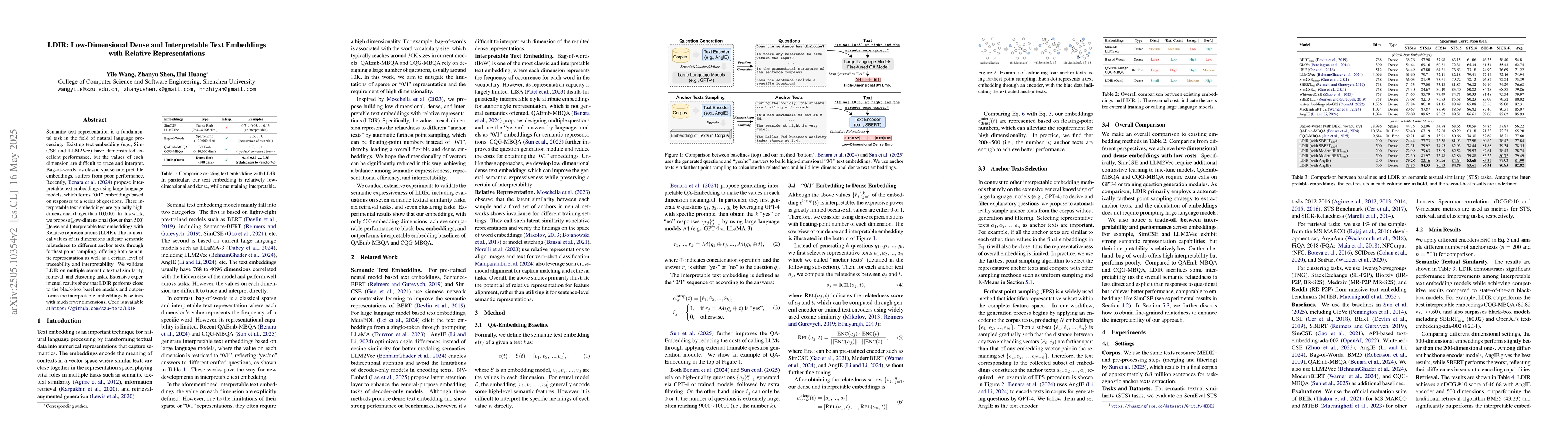 Researchers propose LDIR, a new method for creating low-dimensional dense and interpretable text embeddings with relative representations, outperforming existing methods in various tasks.