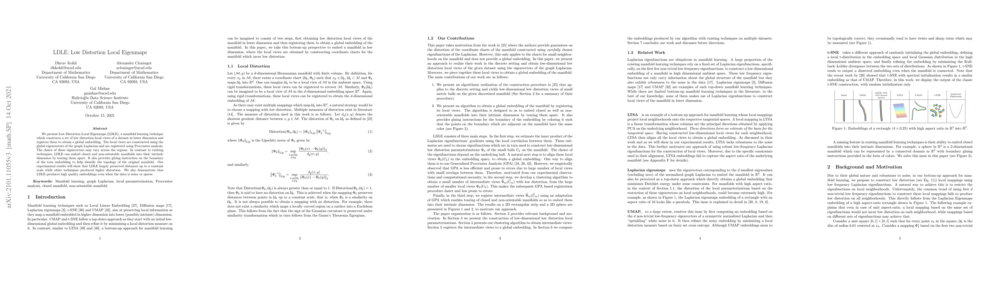 LDLE is a novel manifold learning technique that constructs low distortion local views of a dataset and registers them for a global embedding, using global eigenvectors of the graph Laplacian and Procrustes analysis. Unlike other methods, LDLE can embed closed and non-orientable manifolds, providing gluing instructions to identify the original manifold's topology while preserving distances.