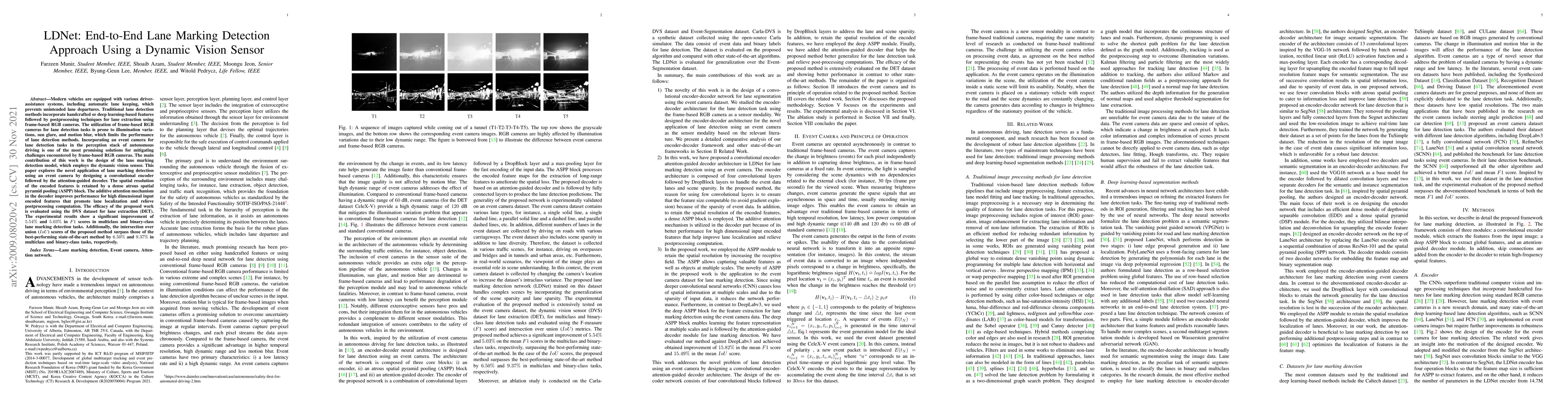 LDNet introduces an end-to-end lane marking detection model using an event camera, addressing limitations of traditional RGB cameras. The model employs a convolutional encoder with an attention-guided decoder and dense ASPP block, achieving superior performance in lane localization and higher F1 scores and IoU scores compared to state-of-the-art methods.