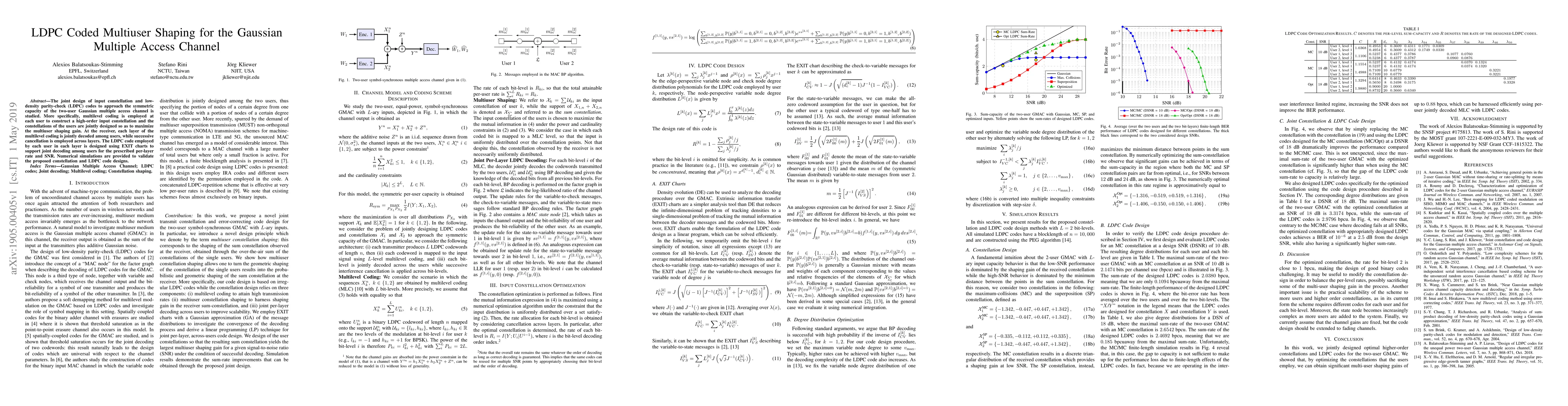 This paper explores the joint design of multilevel coding and LDPC codes to optimize the performance of a two-user Gaussian multiple access channel, aiming to approach its symmetric capacity. It employs multilevel coding to construct high-order input constellations and maximizes multiuser shaping gain through joint constellation and LDPC code design, validated by numerical simulations.
