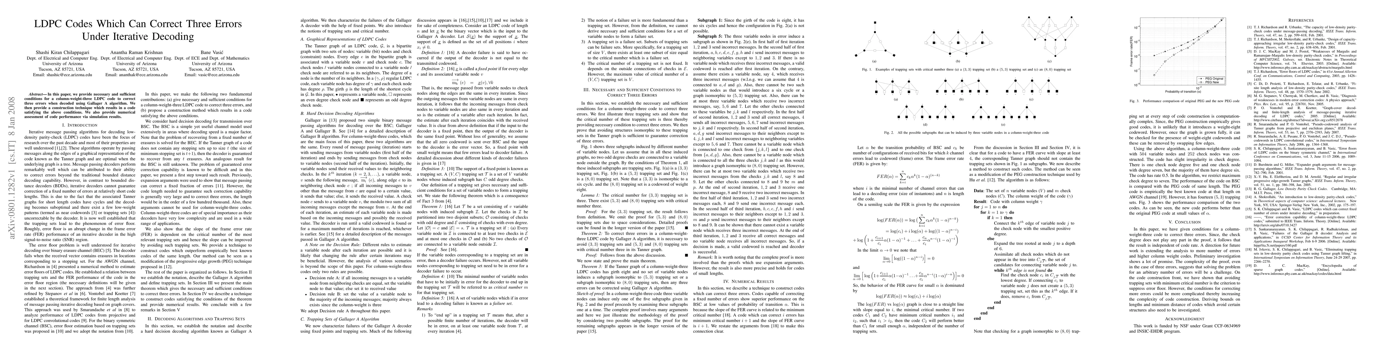 In this paper, we provide necessary and sufficient conditions for a column-weight-three LDPC code to correct three errors when decoded using Gallager A algorithm. We then provide a construction technique which results in a code satisfying the above conditions. We also provide numerical assessment of code performance via simulation results.
