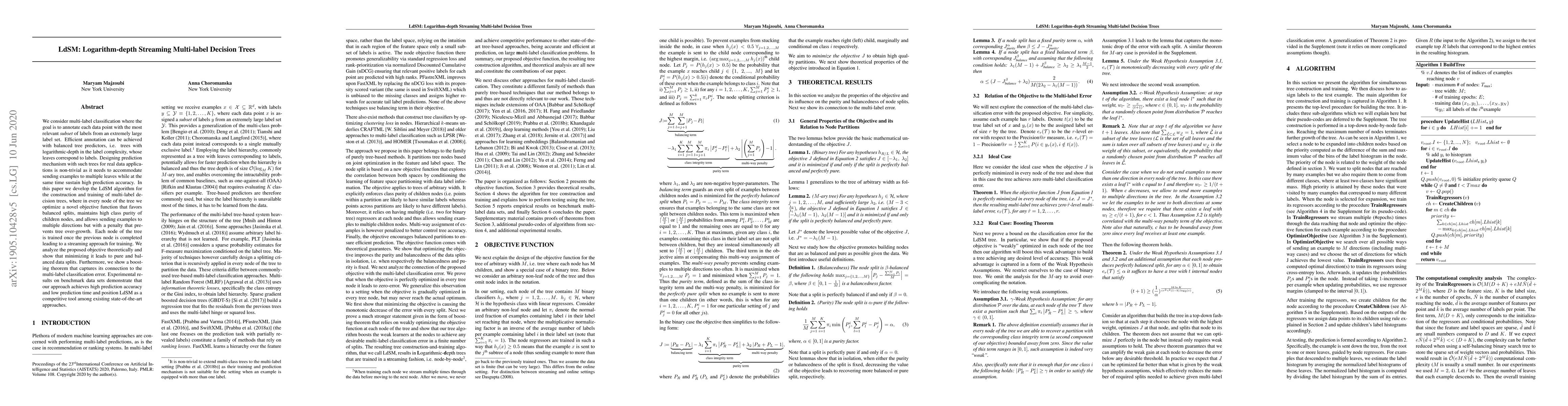 We consider multi-label classification where the goal is to annotate each data point with the most relevant $\textit{subset}$ of labels from an extremely large label set. Efficient annotation can be achieved with balanced tree predictors, i.e. trees with logarithmic-depth in the label complexity, whose leaves correspond to labels. Designing prediction mechanism with such trees for real data applications is non-trivial as it needs to accommodate sending examples to multiple leaves while at the same time sustain high prediction accuracy. In this paper we develop the LdSM algorithm for the construction and training of multi-label decision trees, where in every node of the tree we optimize a novel objective function that favors balanced splits, maintains high class purity of children nodes, and allows sending examples to multiple directions but with a penalty that prevents tree over-growth. Each node of the tree is trained once the previous node is completed leading to a streaming approach for training. We analyze the proposed objective theoretically and show that minimizing it leads to pure and balanced data splits. Furthermore, we show a boosting theorem that captures its connection to the multi-label classification error. Experimental results on benchmark data sets demonstrate that our approach achieves high prediction accuracy and low prediction time and position LdSM as a competitive tool among existing state-of-the-art approaches.