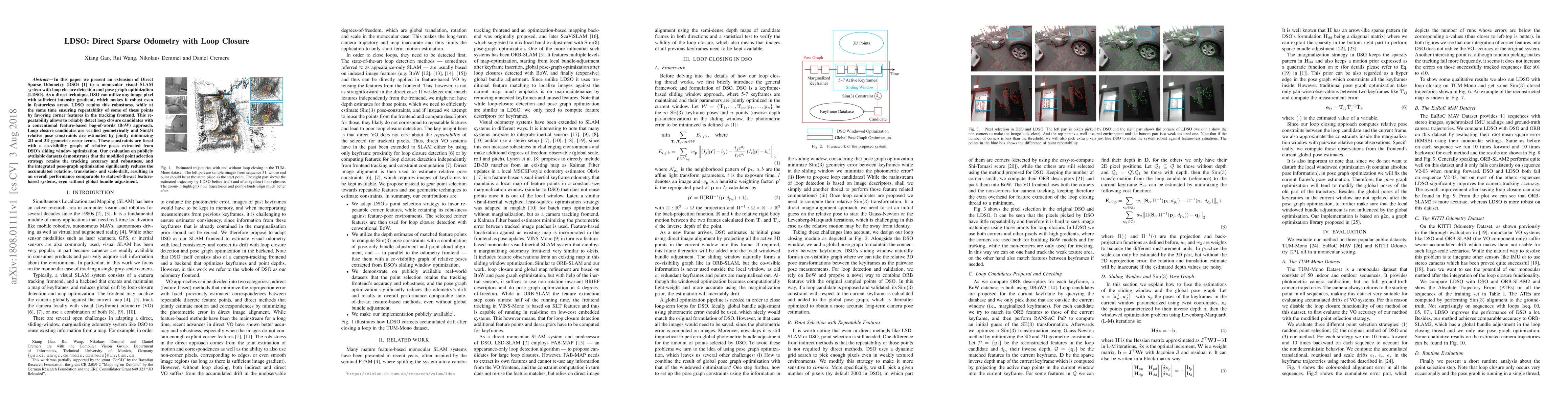 LDSO extends Direct Sparse Odometry to a monocular visual SLAM system with loop closure and pose-graph optimization, maintaining robustness in featureless areas and reducing drift through integrated optimization. The method achieves comparable performance to state-of-the-art systems by favoring corner features and verifying loop closures geometrically.