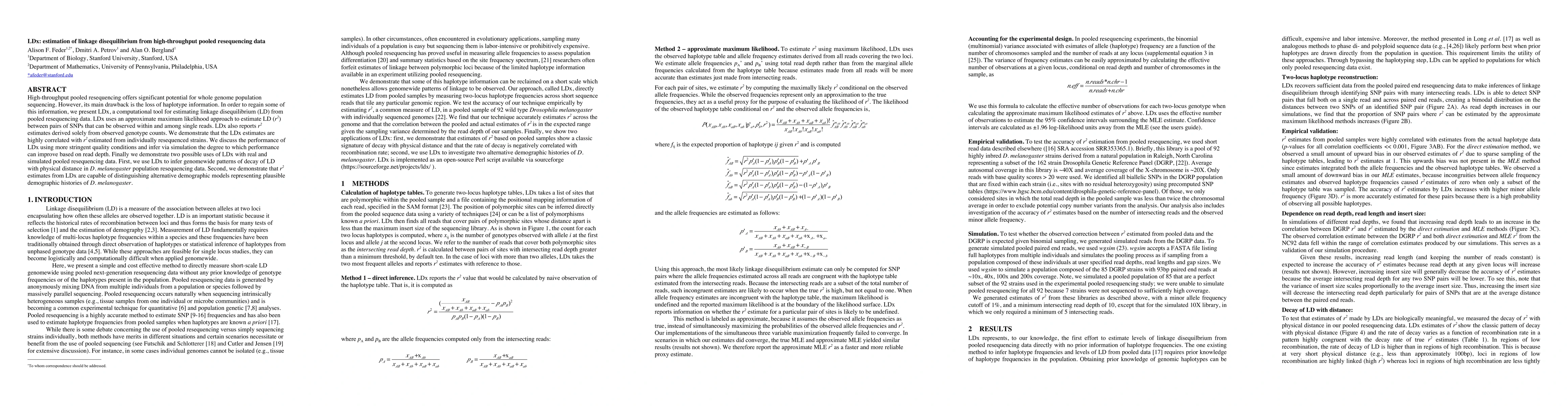 LDx is a computational tool for estimating linkage disequilibrium from high-throughput pooled resequencing data, using an approximate maximum likelihood approach. It demonstrates high correlation with LD estimates from individually resequenced strains and can infer genomewide LD decay patterns and distinguish demographic models in D. melanogaster.