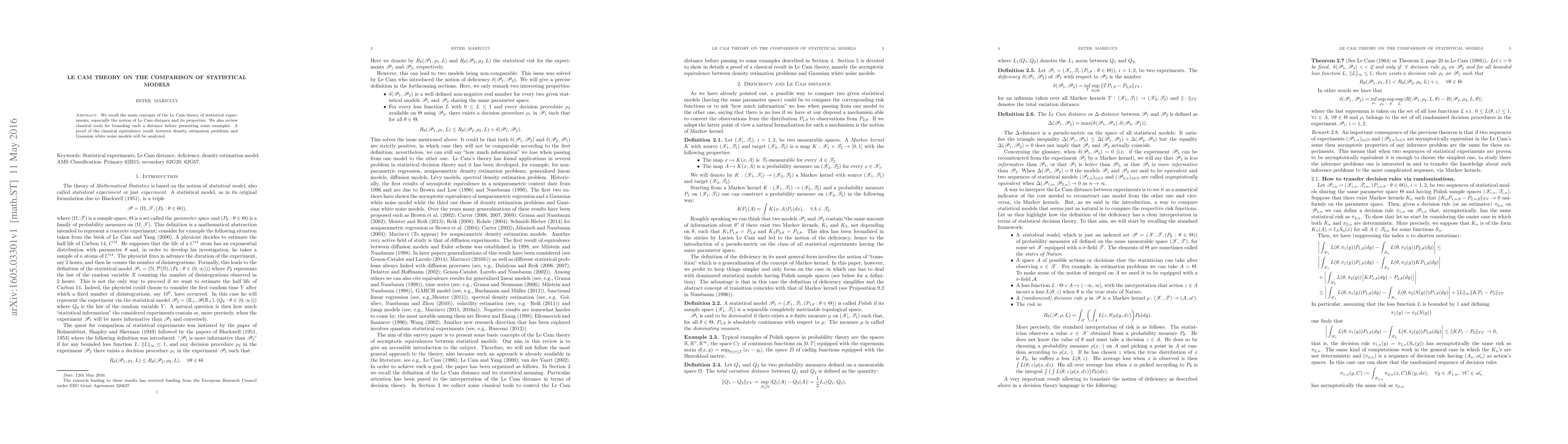 Summary: This paper reviews Le Cam's theory on statistical experiments, focusing on the Le Cam distance and its bounding methods, and analyzes the equivalence between density estimation problems and Gaussian white noise models. Examples and a proof of the classical equivalence result are presented.