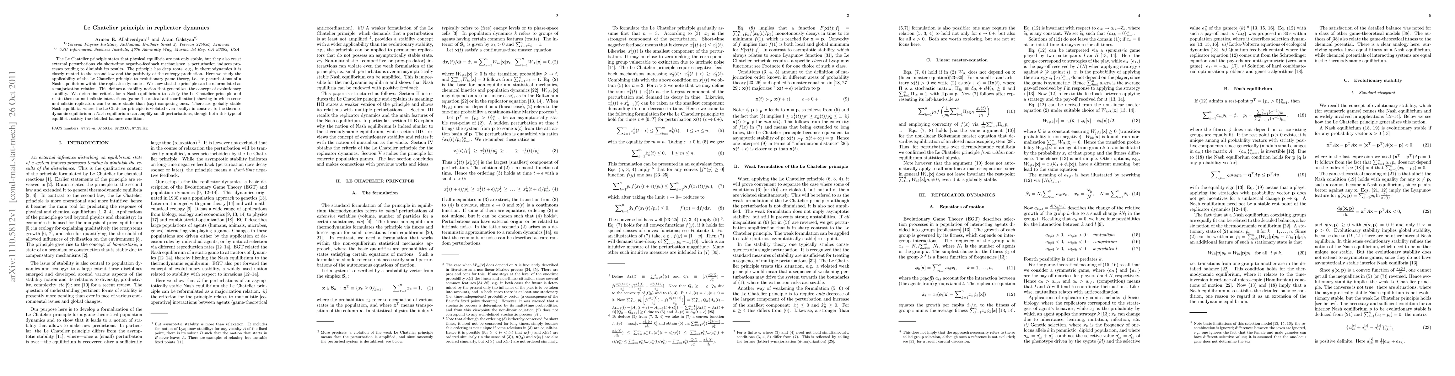 This paper explores the Le Chatelier principle's application to evolutionary game theory, reformulating it as a majorization relation that generalizes evolutionary stability. It identifies conditions under which Nash equilibria exhibit this principle, highlighting that mutualistic interactions can lead to greater stability compared to competitive ones.