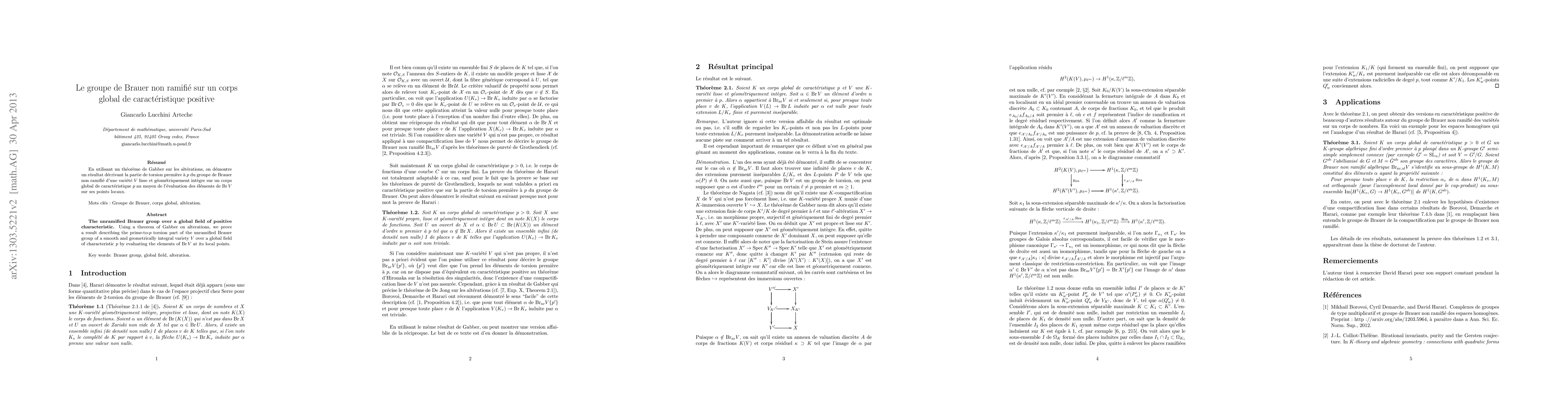 En utilisant un th\'eor\`eme de Gabber sur les alt\'erations, on d\'emontre un r\'esultat d\'ecrivant la partie de torsion premi\`ere \`a $p$ du groupe de Brauer non ramifi\'e d'une vari\'et\'e $V$ lisse et g\'eom\'etriquement int\`egre sur un corps global de caract\'eristique $p$ au moyen de l'\'evaluation des \'el\'ements de $\Br V$ sur ses points locaux. Using a theorem of Gabber on alterations, we prove a result describing the prime-to-$p$ torsion part of the unramified Brauer group of a smooth and geometrically integral variety $V$ over a global field of characteristic $p$ by evaluating the elements of $\Br V$ at its local points.