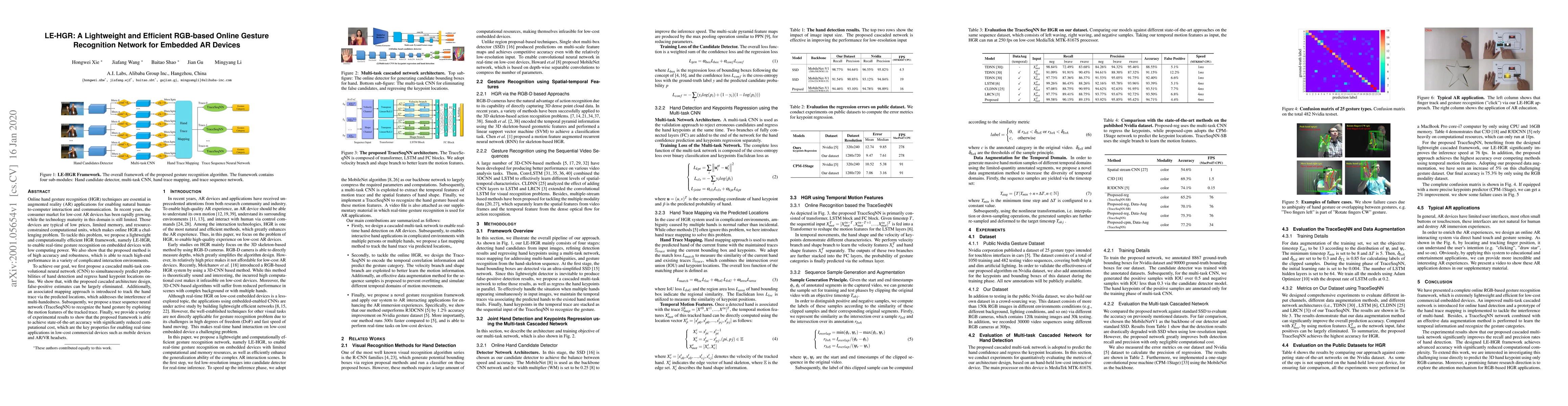 This paper proposes a lightweight and efficient online hand gesture recognition (HGR) framework, LE-HGR, designed for embedded AR devices with limited computational resources. The proposed framework utilizes a cascaded multi-task convolutional neural network and a trace sequence neural network to achieve high accuracy and real-time performance, making it suitable for low-cost AR applications.