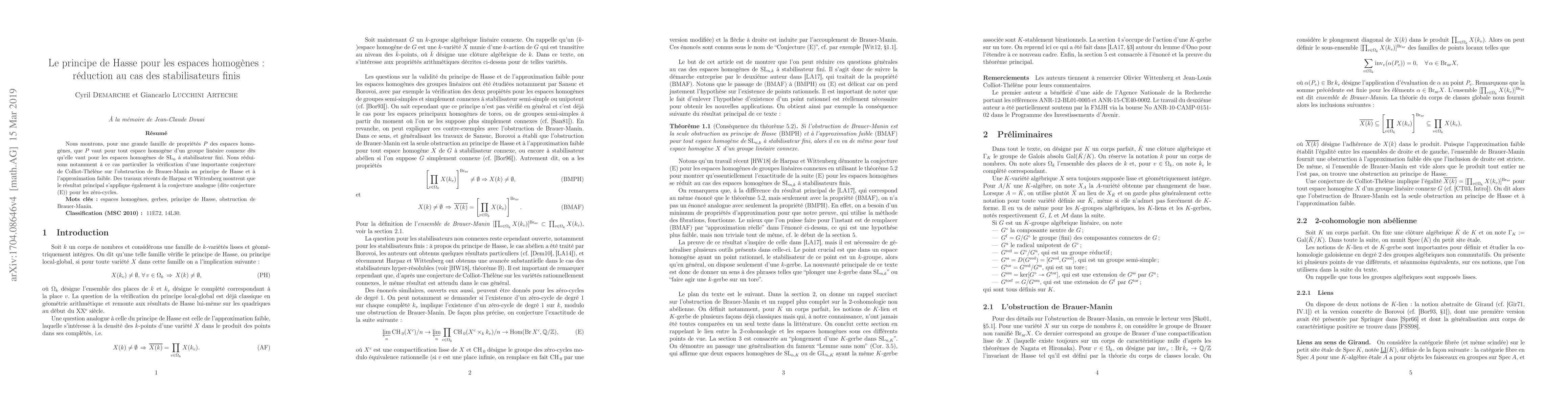 The paper presents a reduction technique that simplifies the verification of properties related to homogeneous spaces under the Hasse principle, leveraging the structure of finite stabilizers.