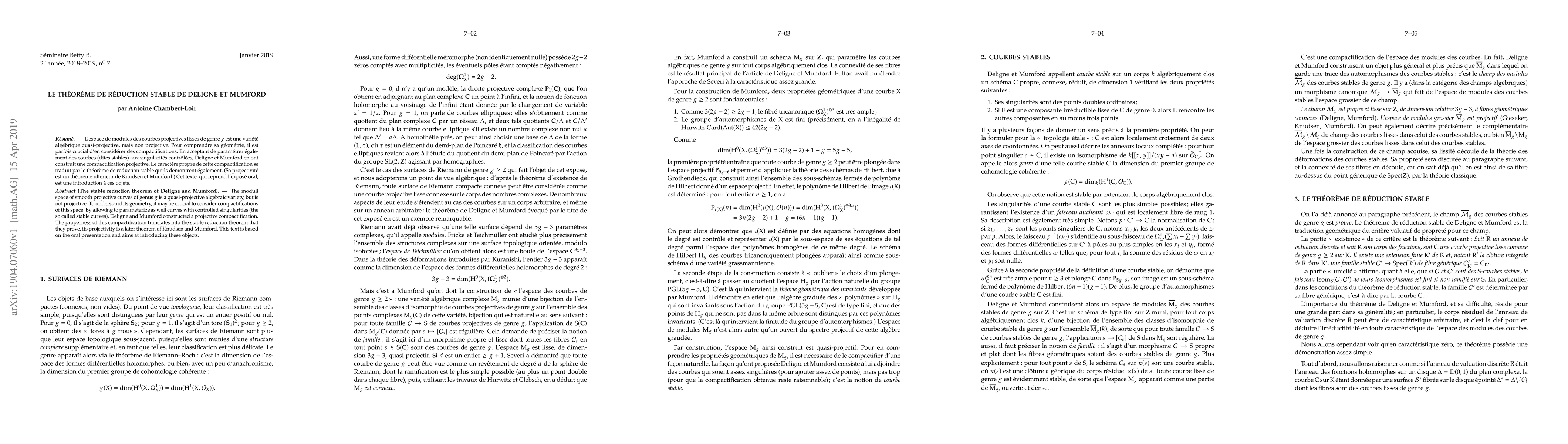 The stable reduction theorem of Deligne and Mumford --- The moduli space of smooth projective curves of genus $g$ is a quasi-projective algebraic variety, but is not projective. To understand its geometry, it may be crucial to consider compactifications of this space. By allowing to parameterize as well curves with controlled singularities (the so called stable curves), Deligne and Mumford constructed a projective compactification. The properness of this compactification translates into the stable reduction theorem that they prove, its projectivity is a later theorem of Knudsen and Mumford. This text is based on the oral presentation and aims at introducing these objects.