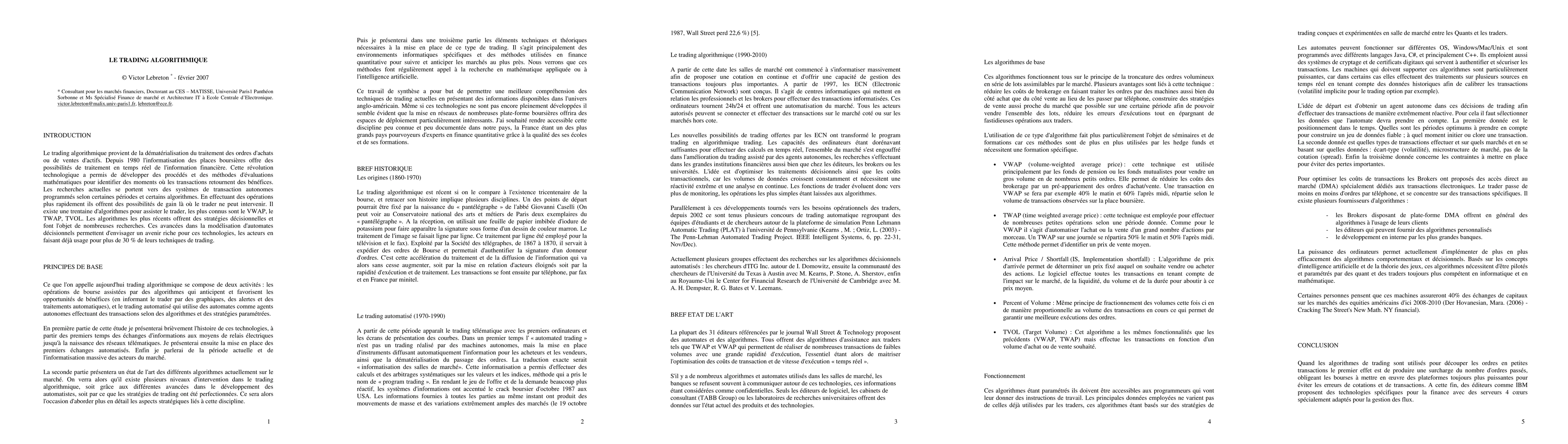 The algorithmic trading comes from digitalisation of the processing of trading assets on financial markets. Since 1980 the computerization of the stock market offers real time processing of financial information. This technological revolution has offered processes and mathematic methods to identify best return on transactions. Current research relates to autonomous transaction systems programmed in certain periods and some algorithms. This offers return opportunities where traders can not intervene. There are about thirty algorithms to assist the traders, the best known are the VWAP, the TWAP, TVOL. The algorithms offer the latest strategies and decision-making are the subject of much research. These advances in modeling decision-making autonomous agent can envisage a rich future for these technologies, the players already in use for more than 30% of their trading.