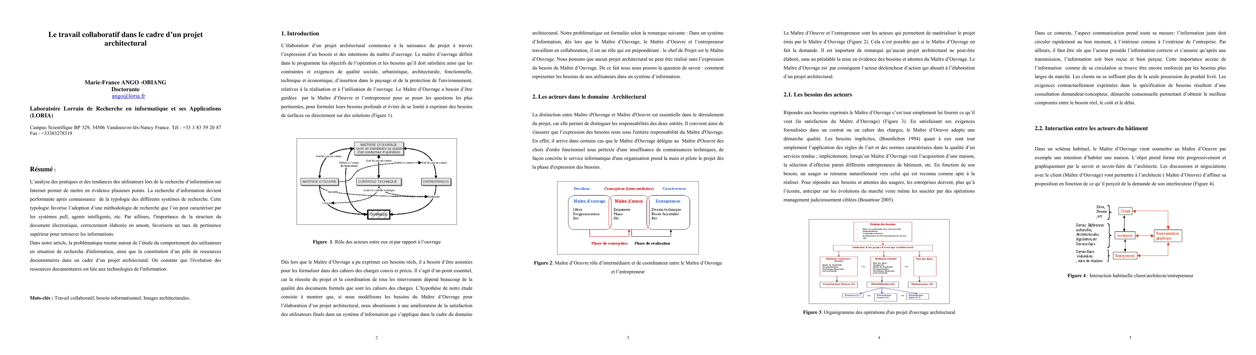 The analysis of the practices and the tendencies of the users at the time of the search for information on Internet makes it possible to highlight several points. The search for information becomes powerful after knowledge of the typology of the various systems of research. This typology supports the adoption of a methodology of research which one can characterize by pull systems, intelligent agents, etc. In addition, the importance of the structure of the electronic document, correctly elaborated in advance, will support a higher relevance ratio to find information. In our article, the problems turn around the study of the behavior of the users in situation of search for information, as well as the constitution of a pole of documentary resources within a framework of an architectural project. It is noted that the evolution of the documentary resources is related to information technologies.