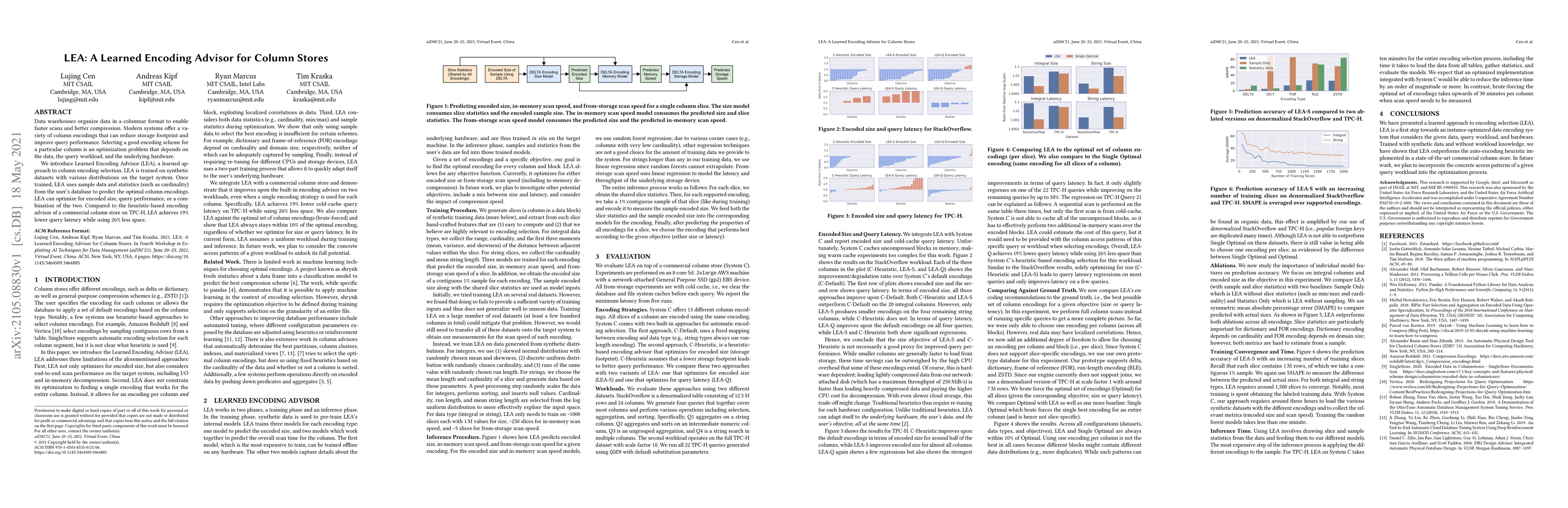 The Learned Encoding Advisor (LEA) optimizes column encoding for data warehouses by predicting the best encoding schemes based on trained data and user statistics, achieving 19% lower query latency and 26% less storage compared to a commercial heuristic-based advisor.