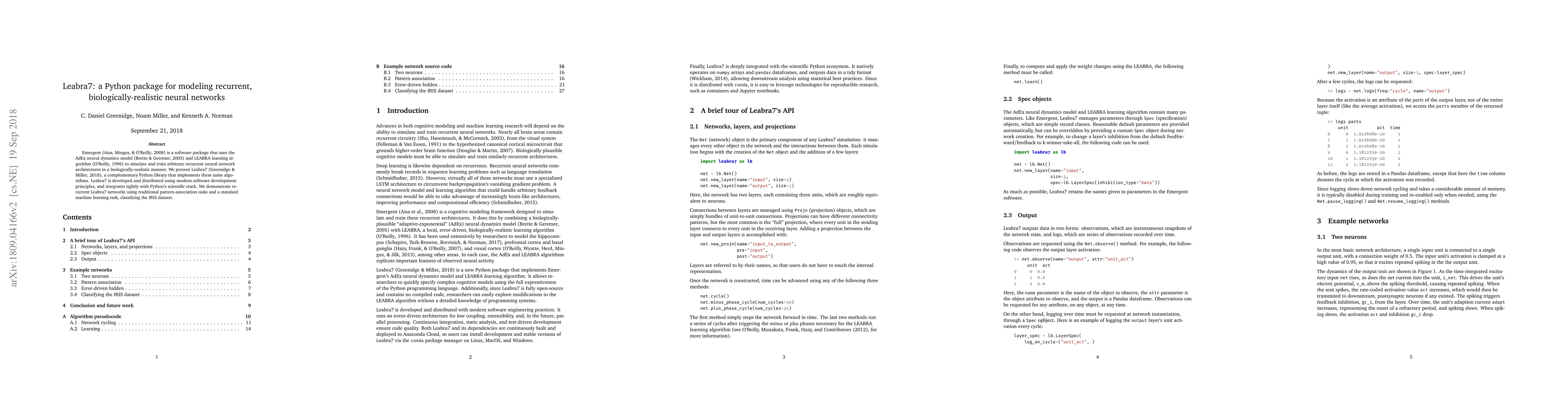 Emergent is a software package that uses the AdEx neural dynamics model and LEABRA learning algorithm to simulate and train arbitrary recurrent neural network architectures in a biologically-realistic manner. We present Leabra7, a complementary Python library that implements these same algorithms. Leabra7 is developed and distributed using modern software development principles, and integrates tightly with Python's scientific stack. We demonstrate recurrent Leabra7 networks using traditional pattern-association tasks and a standard machine learning task, classifying the IRIS dataset.