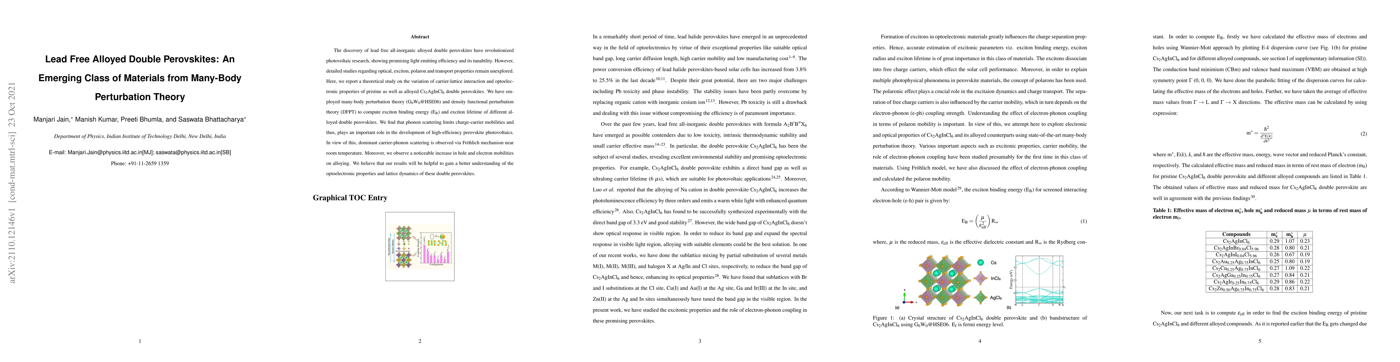 This paper investigates the optoelectronic properties of lead-free alloyed double perovskites using many-body perturbation theory, revealing that phonon scattering significantly impacts charge-carrier mobility. The study finds enhanced hole and electron mobilities upon alloying, suggesting improved photovoltaic performance.