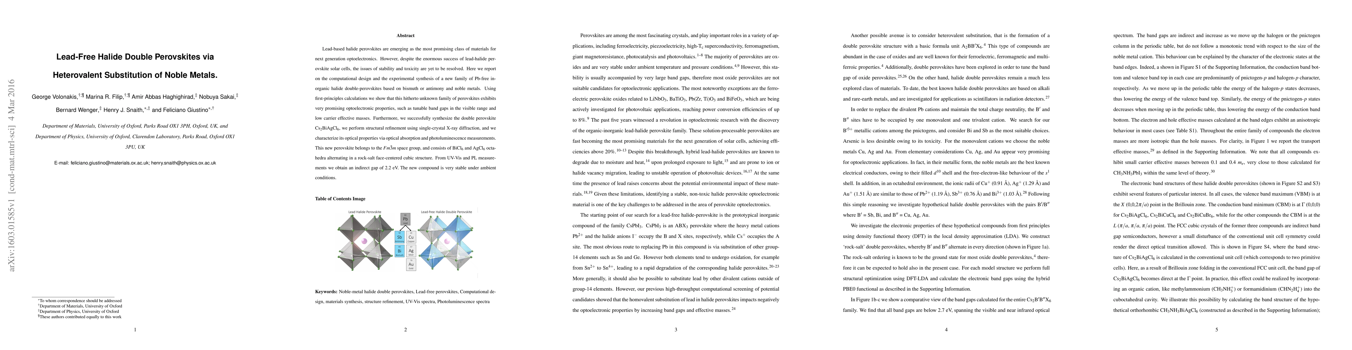 This paper reports on the computational design and synthesis of lead-free halide double perovskites using bismuth or antimony with noble metals, showing promising optoelectronic properties. The synthesized Cs2BiAgCl6 exhibits a stable rock-salt cubic structure, a tunable band gap, and stability under ambient conditions.