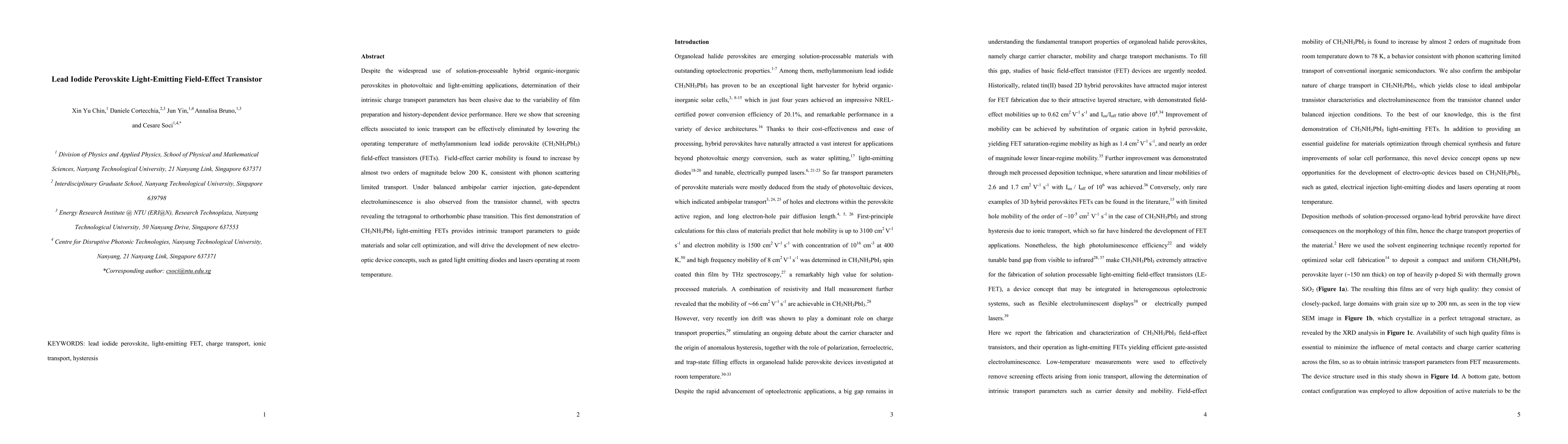This paper demonstrates that methylammonium lead iodide perovskite light-emitting field-effect transistors exhibit significantly improved carrier mobility and electroluminescence at low temperatures, revealing intrinsic transport properties and enabling potential for new electro-optic devices.