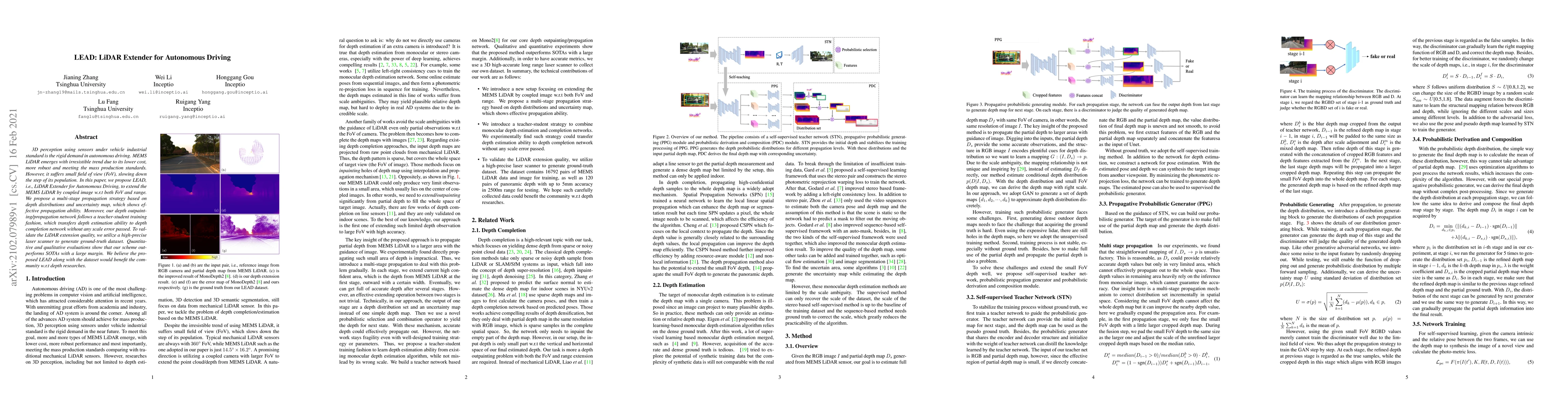 3D perception using sensors under vehicle industrial standard is the rigid demand in autonomous driving. MEMS LiDAR emerges with irresistible trend due to its lower cost, more robust, and meeting the mass-production standards. However, it suffers small field of view (FoV), slowing down the step of its population. In this paper, we propose LEAD, i.e., LiDAR Extender for Autonomous Driving, to extend the MEMS LiDAR by coupled image w.r.t both FoV and range. We propose a multi-stage propagation strategy based on depth distributions and uncertainty map, which shows effective propagation ability. Moreover, our depth outpainting/propagation network follows a teacher-student training fashion, which transfers depth estimation ability to depth completion network without any scale error passed. To validate the LiDAR extension quality, we utilize a high-precise laser scanner to generate a ground-truth dataset. Quantitative and qualitative evaluations show that our scheme outperforms SOTAs with a large margin. We believe the proposed LEAD along with the dataset would benefit the community w.r.t depth researches.