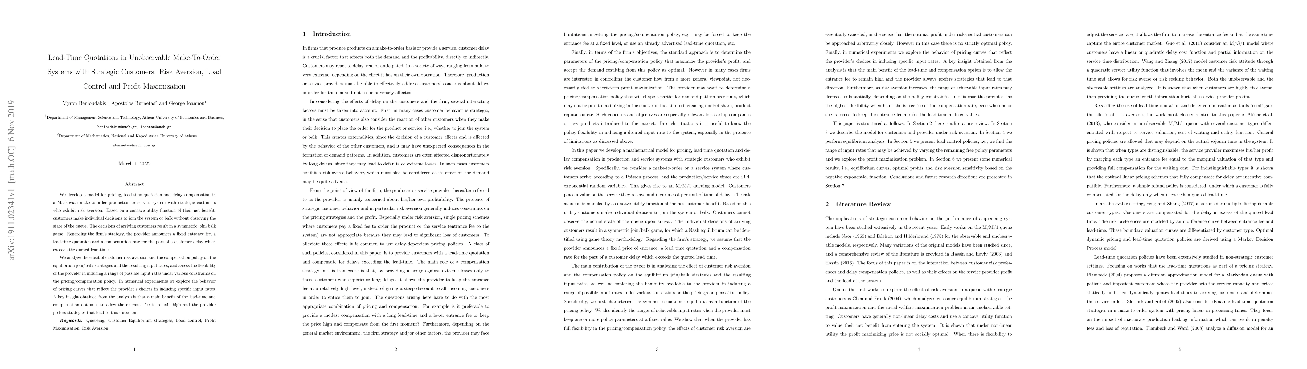 We develop a model for pricing, lead-time quotation and delay compensation in a Markovian make-to-order production or service system with strategic customers who exhibit risk aversion. Based on a concave utility function of their net benefit, customers make individual decisions to join the system or balk without observing the state of the queue. The decisions of arriving customers result in a symmetric join/balk game. Regarding the firm's strategy, the provider announces a fixed entrance fee, a lead-time quotation and a compensation rate for the part of a customer delay which exceeds the quoted lead-time. We analyze the effect of customer risk aversion and the compensation policy on the equilibrium join/balk strategies and the resulting input rates, and assess the flexibility of the provider in inducing a range of possible input rates under various constraints on the pricing/compensation policy. In numerical experiments we explore the behavior of pricing curves that reflect the provider's choices in inducing specific input rates. A key insight obtained from the analysis is that a main benefit of the lead-time and compensation option is to allow the entrance fee to remain high and the provider prefers strategies that lead to this direction.