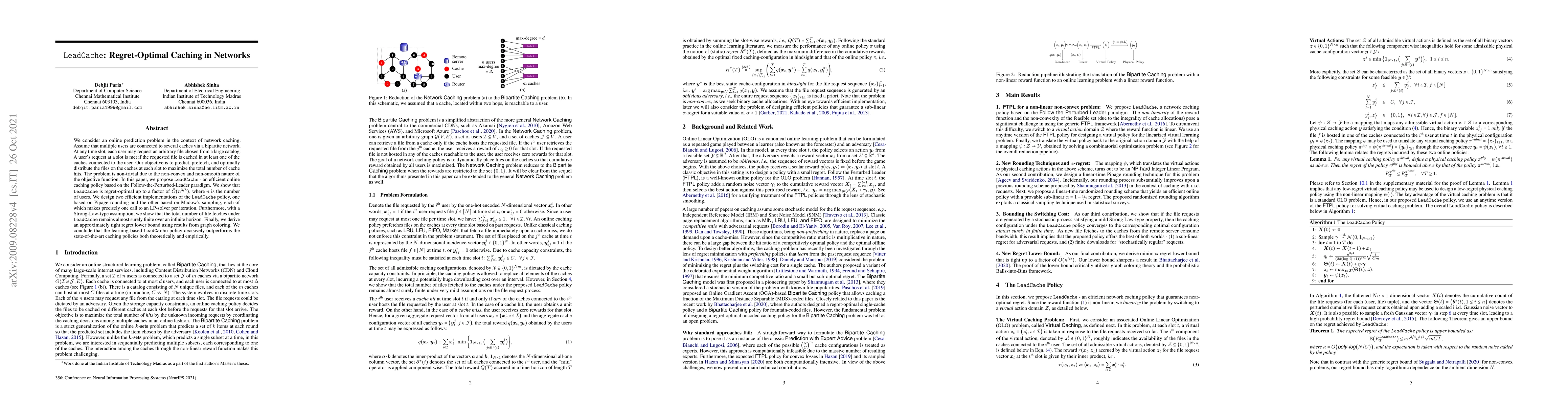 We consider an online prediction problem in the context of network caching. Assume that multiple users are connected to several caches via a bipartite network. At any time slot, each user may request an arbitrary file chosen from a large catalog. A user's request at a slot is met if the requested file is cached in at least one of the caches connected to the user. Our objective is to predict, prefetch, and optimally distribute the files on the caches at each slot to maximize the total number of cache hits. The problem is non-trivial due to the non-convex and non-smooth nature of the objective function. In this paper, we propose $\texttt{LeadCache}$ - an efficient online caching policy based on the Follow-the-Perturbed-Leader paradigm. We show that $\texttt{LeadCache}$ is regret-optimal up to a factor of $\tilde{O}(n^{3/8}),$ where $n$ is the number of users. We design two efficient implementations of the $\texttt{LeadCache}$ policy, one based on Pipage rounding and the other based on Madow's sampling, each of which makes precisely one call to an LP-solver per iteration. Furthermore, with a Strong-Law-type assumption, we show that the total number of file fetches under $\texttt{LeadCache}$ remains almost surely finite over an infinite horizon. Finally, we derive an approximately tight regret lower bound using results from graph coloring. We conclude that the learning-based $\texttt{LeadCache}$ policy decisively outperforms the state-of-the-art caching policies both theoretically and empirically.