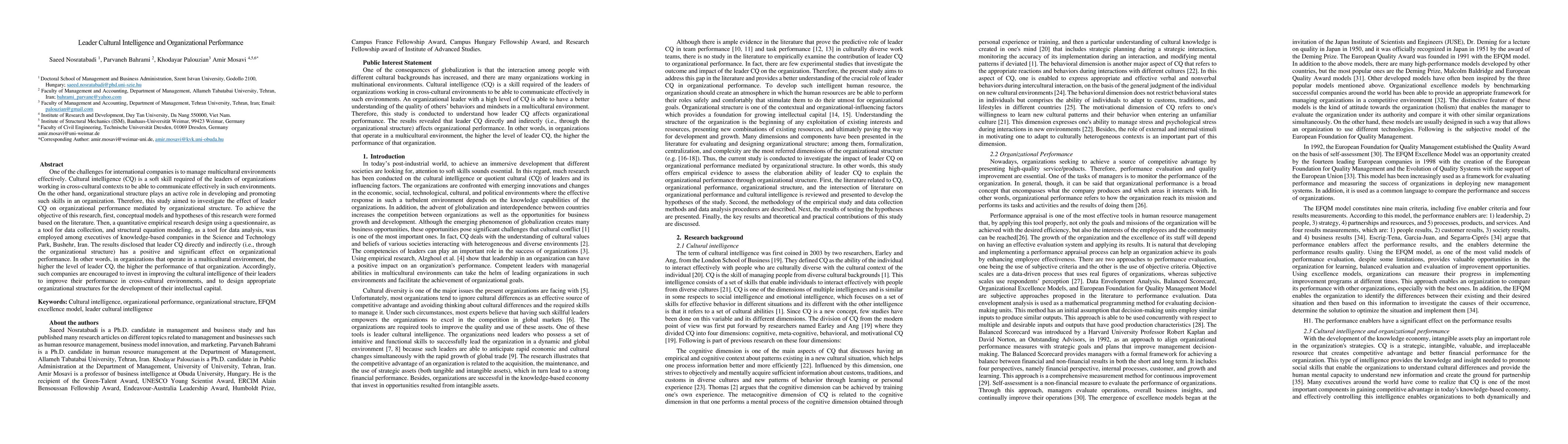 This study examines how leader cultural intelligence (CQ) impacts organizational performance, with a focus on the mediating role of organizational structure. Findings indicate that higher leader CQ positively influences organizational performance both directly and indirectly through the organizational structure, suggesting that companies should enhance leader CQ and design supportive structures to improve performance in multicultural environments.