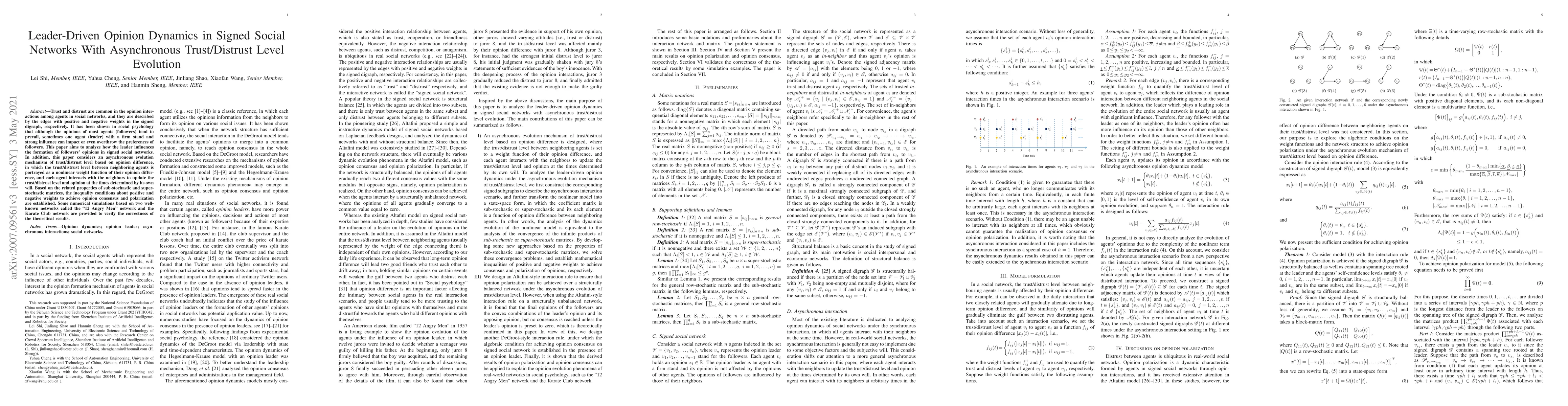 This paper investigates how a leader's strong influence can shape followers' opinions in signed social networks, where trust and distrust are represented by positive and negative weights. It introduces an asynchronous mechanism for evolving trust/distrust levels based on opinion differences, and establishes conditions for opinion consensus and polarization using sub-stochastic and super-stochastic matrices, validated through simulations on the "12 Angry Men" and Karate Club networks.