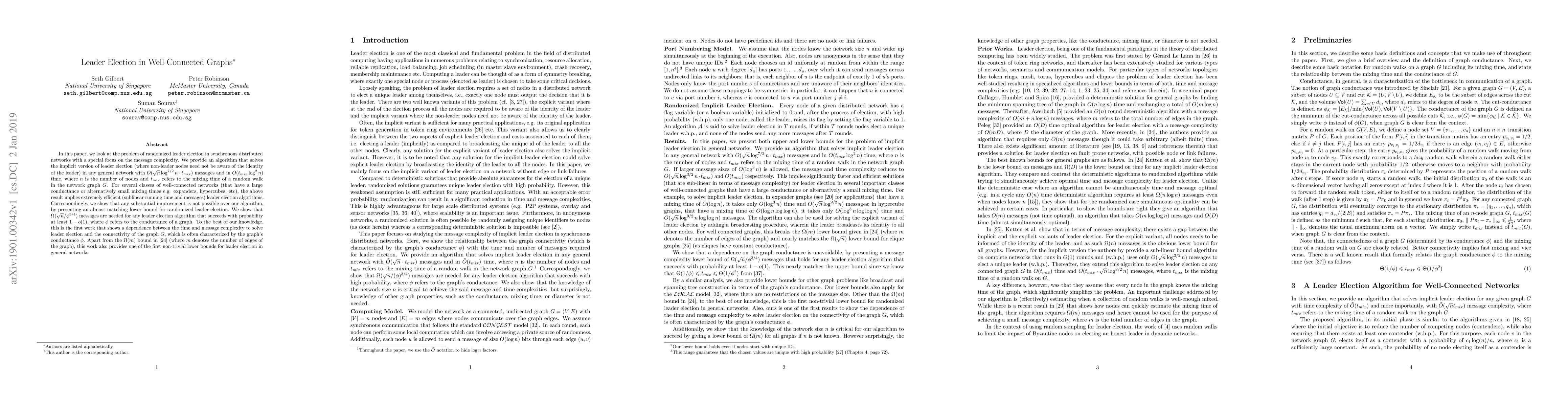 This paper presents an efficient randomized leader election algorithm for distributed networks, achieving $O(\sqrt{n} \log^{7/2} n \cdot t_{mix})$ messages and $O(t_{mix}\log^2 n)$ time. It demonstrates sublinear performance for well-connected networks and establishes a lower bound of $\Omega(\sqrt{n}/\phi^{3/4})$ messages for general networks, highlighting the relationship between graph connectivity and leader election complexity.