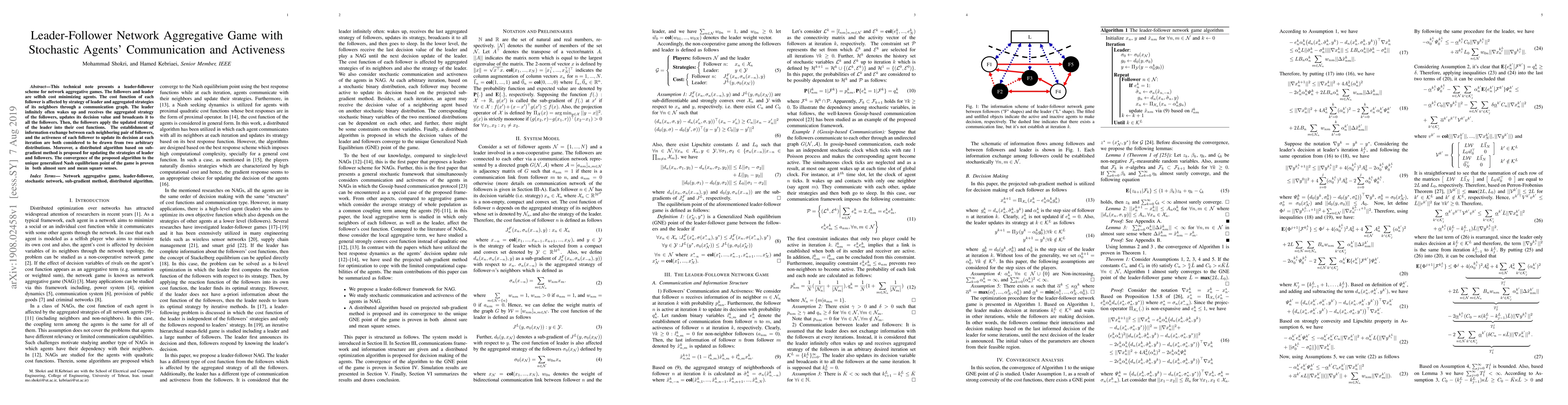 This paper introduces a leader-follower network game where followers update their strategies based on the leader's decisions and neighbors' strategies, with communication and activeness modeled as stochastic processes. A distributed subgradient method is proposed and proven to converge to the unique generalized Nash equilibrium.