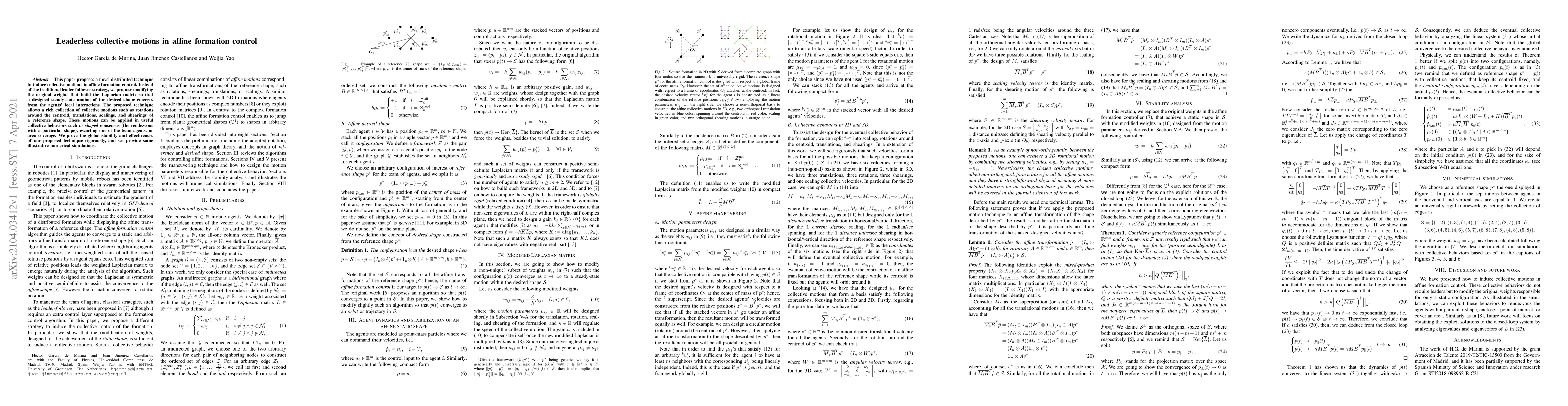 This paper proposes a new technique to induce collective motions in formation control without a leader, allowing for diverse behaviors like rotations, translations, and shape modifications.